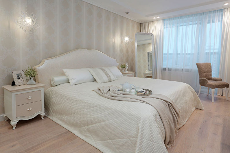 - Um quarto muito delicado, em que o bege claro está em tudo: colcha, cortinas, papel de parede. Além disso, só o branco vai. Para alguns, esta opção pode parecer muito enfadonha, mas esta sala definitivamente está disposta a descansar.