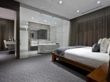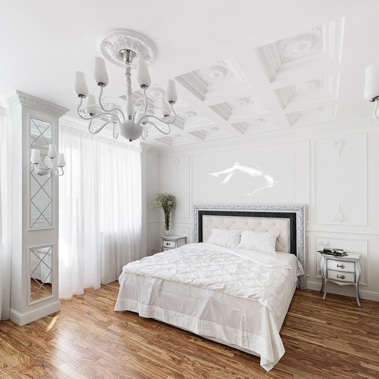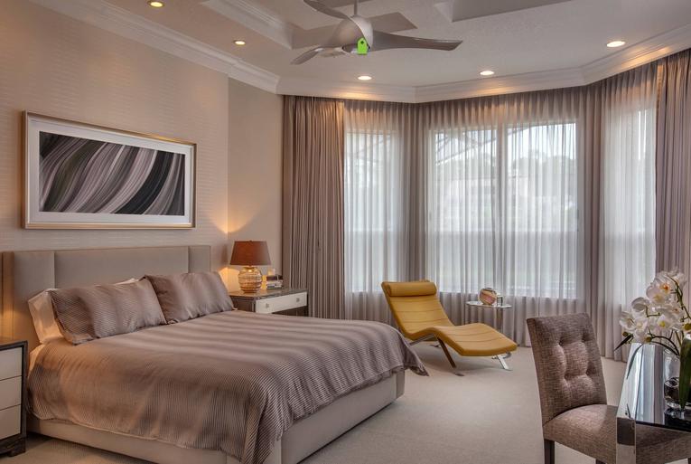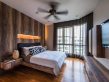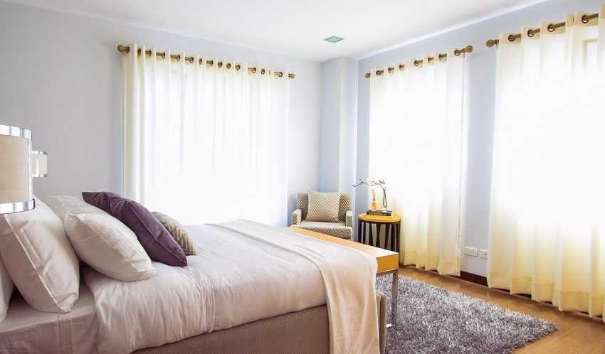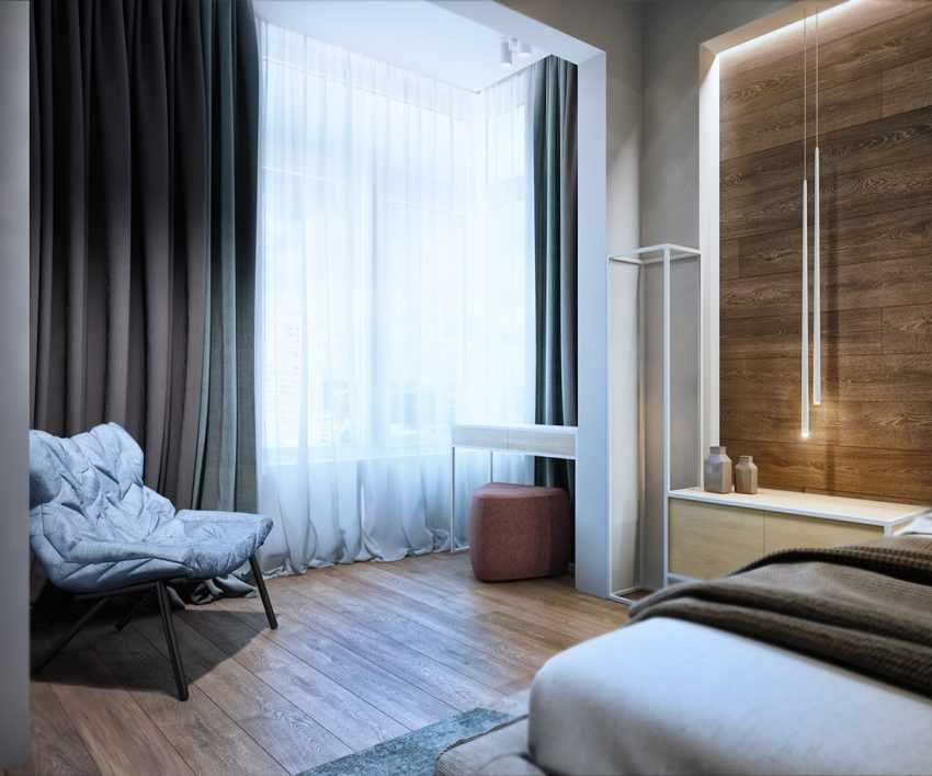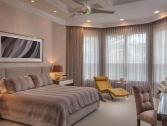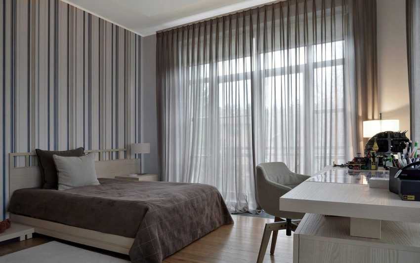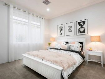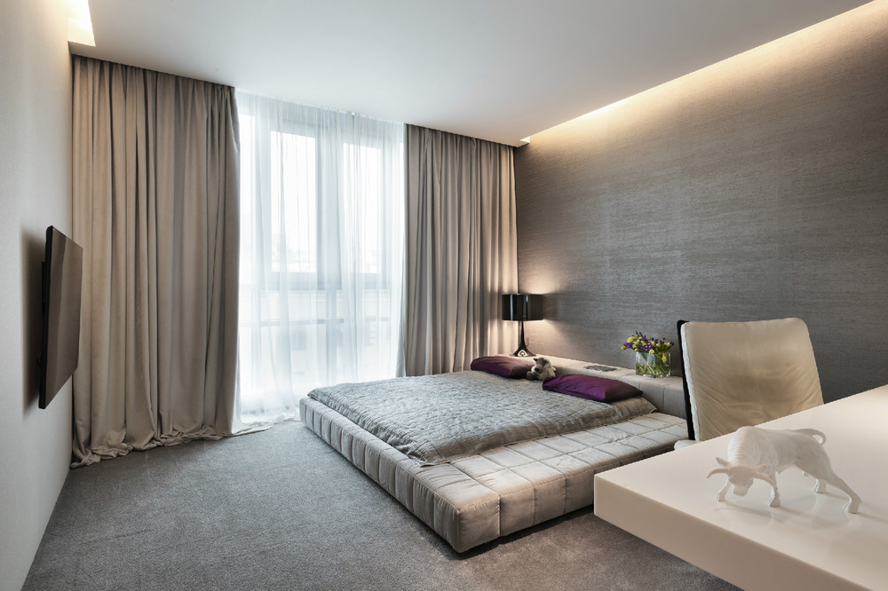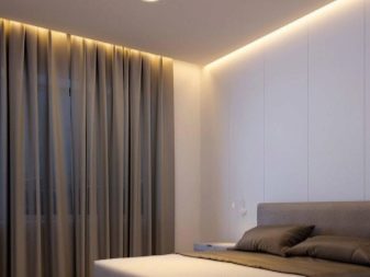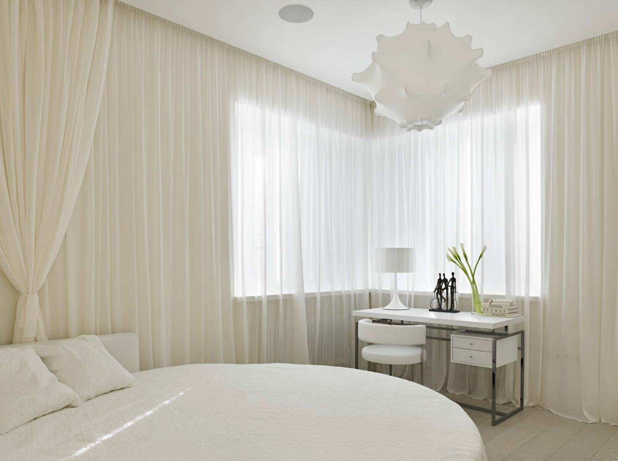 O design geral da área de dormir exige requisitos estritos para o design do tule. Então, para estilos de alta tecnologia e minimalismo, uma tela exclusivamente monocromática sem padrões e estampas é permitida. As cores principais são branco, cinza e preto. Outros tons são possíveis, mas devem ser combinados com o design geral da sala. Nesses interiores, não são necessárias cortinas, o tule deve ser o mais uniforme possível e com toda sua aparência enfatizar as linhas e formas lacônicas presentes no conceito desses estilos.