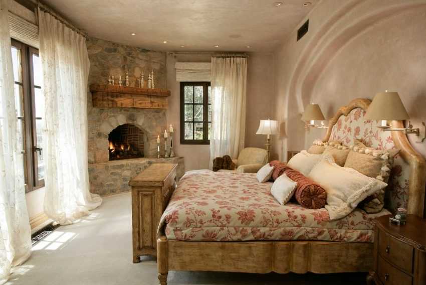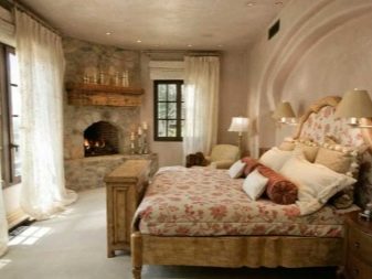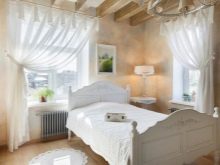 Mas no quarto de estilo provençal, os materiais com padrões florais ou telas multicoloridas têm uma aparência orgânica. No entanto, neste caso, é importante não permitir uma variação excessiva.Por exemplo, se você comprou cortinas com flores, deve levar um tule sólido para elas. No estilo country, véus e tules de corda são apropriados.