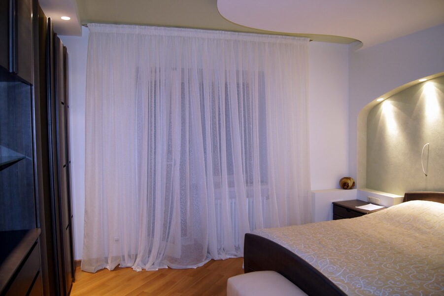 O tule do quarto pode ser longo ou curto. As cortinas transparentes longas podem ser uma tela contínua ou formar um conjunto de duas metades. Às vezes, as janelas são decoradas com um grande número de elementos, por exemplo, um conjunto de três ou quatro faixas estreitas - esta é uma técnica bastante prática que fornece acesso livre à janela. Isso é especialmente verdadeiro se houver muitas plantas de interior no peitoril da janela.