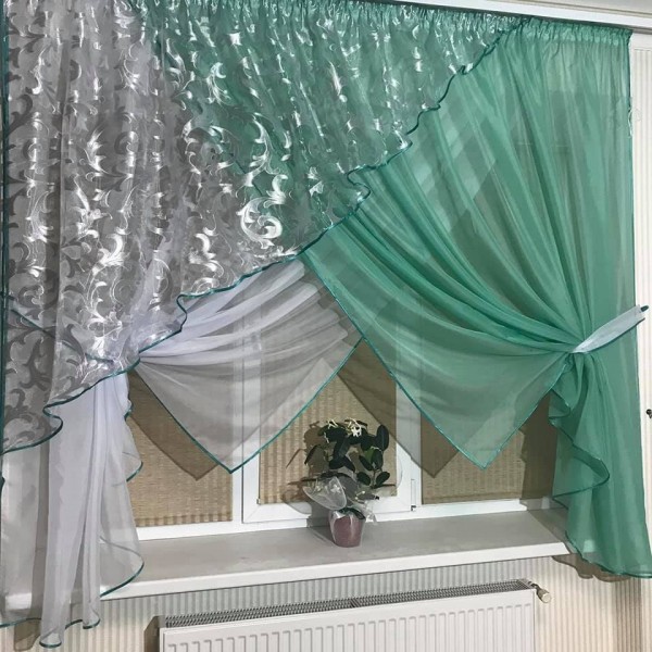 Em geral, o design das cortinas depende diretamente da importância da acessibilidade ao peitoril e caixilhos da janela. Se levarmos em conta apenas o lado estético da questão, sem levar em conta o prático, então em breve até o tule mais luxuoso e caro ficará em estado de degradação total. Ele pode ser apertado com uma faixa ou pisado inadvertidamente na borda da tela. Bem, se você não pode fazer uma escolha entre um modelo longo e um curto, escolha um oblíquo - essas cortinas cobrem apenas parte da abertura da janela e parecem elegantes em qualquer design.