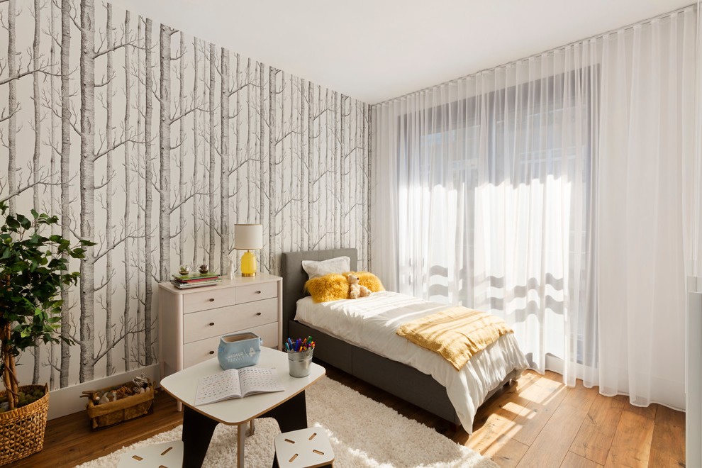 Tule pode ser simples, ter estampas, padrões tridimensionais e até impressão de fotos. Normalmente, os desenhos das cortinas estão em harmonia com o resto dos tecidos do quarto, estofamento de móveis, cortinas ou itens decorativos.