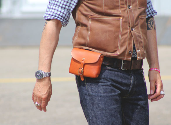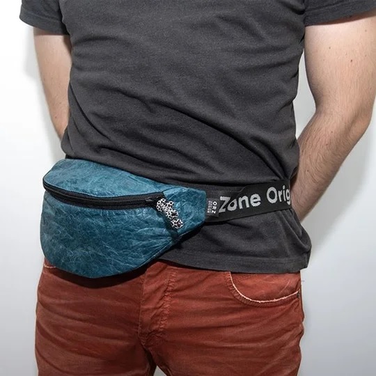 Opções de cinto e perna disponíveis para proteção contra roubo. No inverno, uma banana fica bem sobre uma jaqueta ou casaco de penas. Modelos recortados de agasalhos são usados desabotoados e a bolsa é usada por baixo.