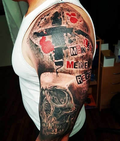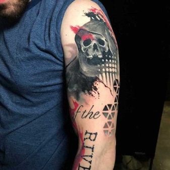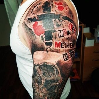- Polca lixo. Toda a apresentação rebelde do estilo está repleta de protestos contra a estrutura geralmente aceita. O fundo de uma tatuagem agressiva geralmente é preto profundo, sobre o qual são aplicadas pinceladas vermelho-sangue.