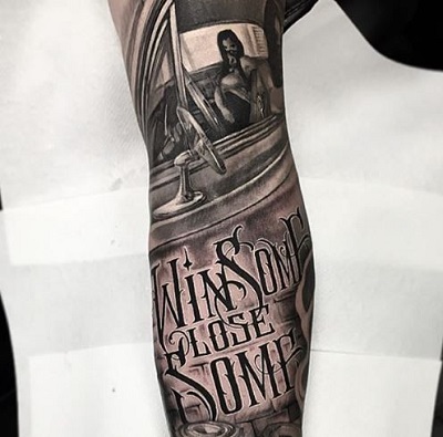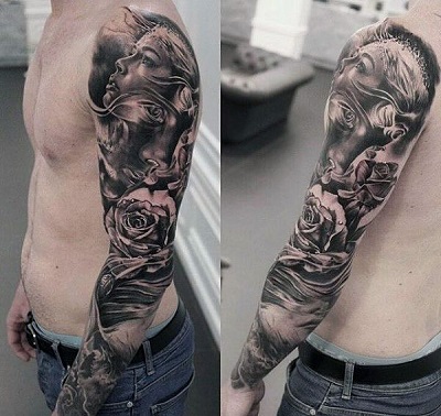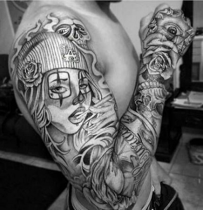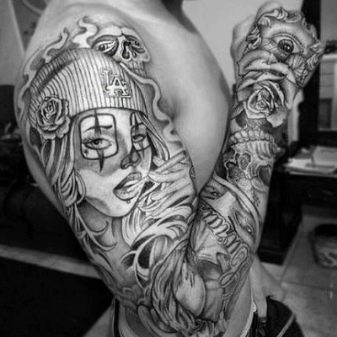 - Chicano... Haverá todos os atributos estereotipados de um filme de ação masculino: armas, dinheiro, carros caros, garotas em trajes de banho. Essa tendência se originou na época dos gangsters. As tatuagens nas mangas nesse estilo são cem por cento masculinas. Mesmo levando em consideração o fato de que às vezes a composição se dilui com flores.