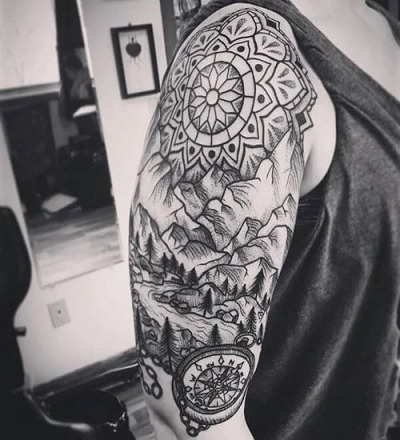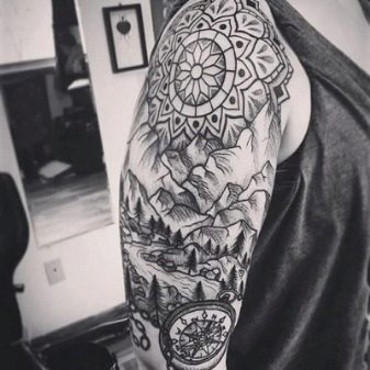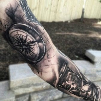 Também vale a pena mencionar um tema que ganhou popularidade não há muito tempo: viagens e tudo o que a acompanha. Há espaço para bússolas, mapas, aviões e ilhas. Um item separado é para marcar tatuagens de paisagem: florestas de coníferas, picos de montanhas, panoramas do mar.