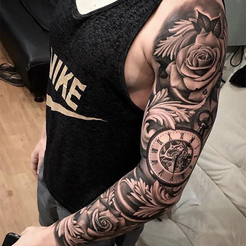A manga totalmente coberta com a tatuagem é todo o braço. O desenho pode ser aplicado não só na área do ombro ao pulso, mas também no pulso, para afetar parte do tórax, a escápula.