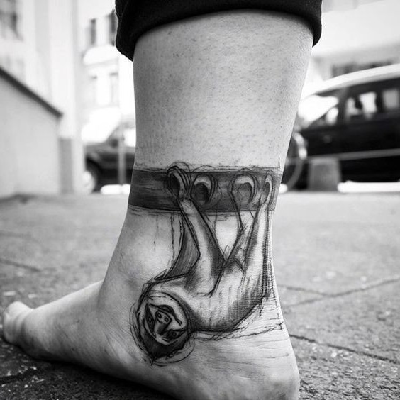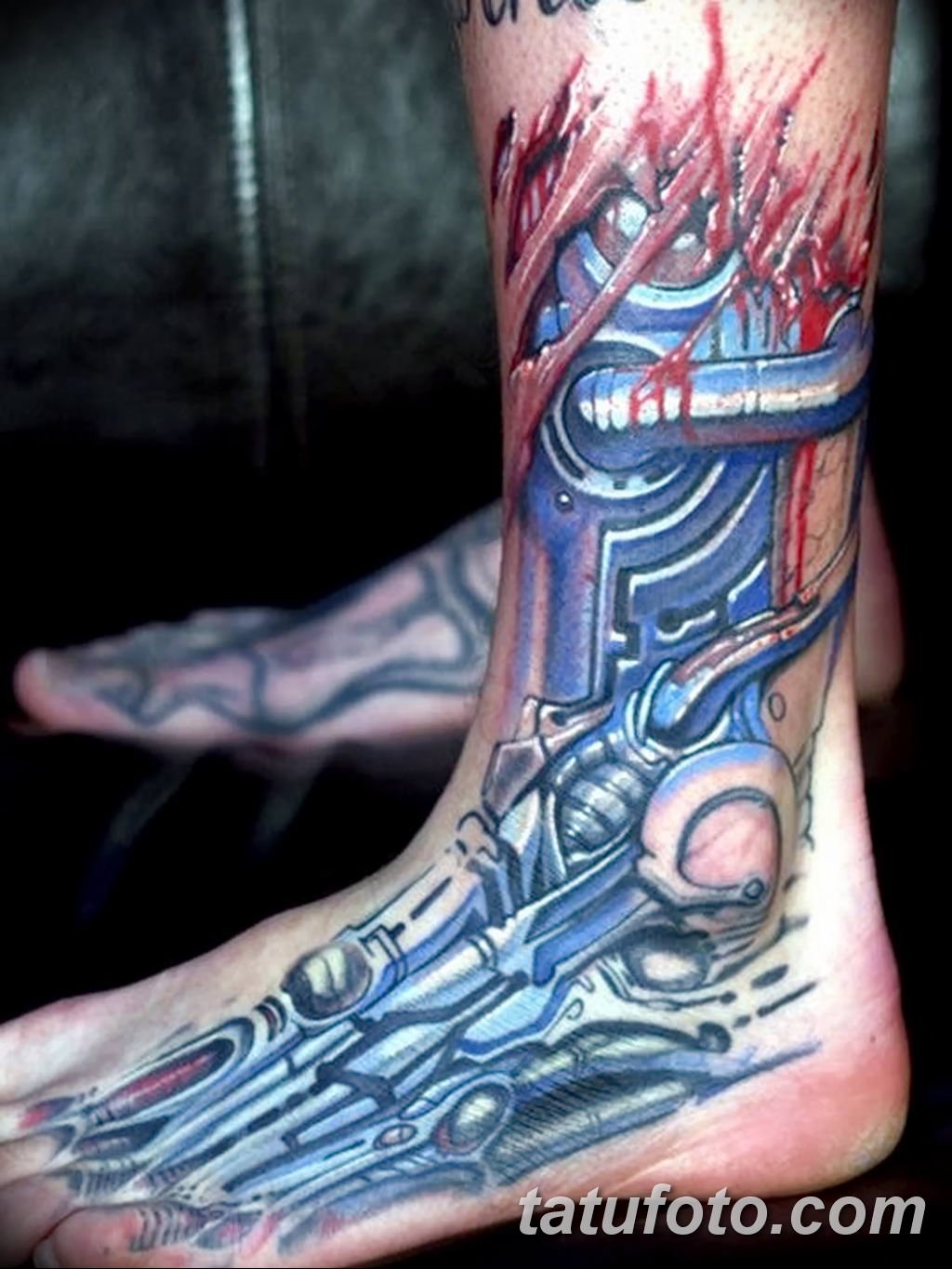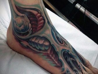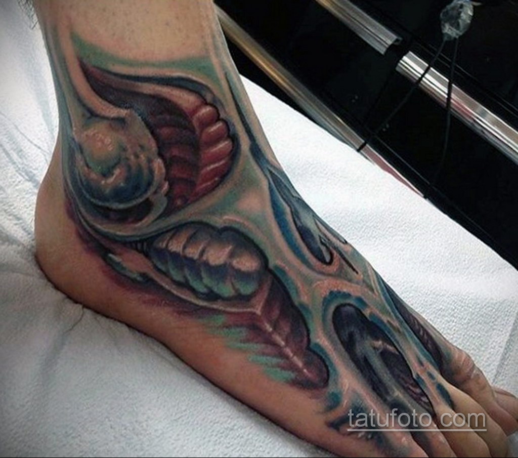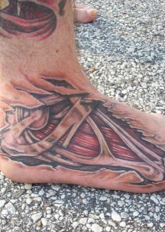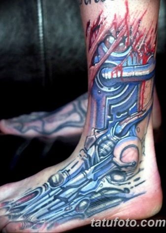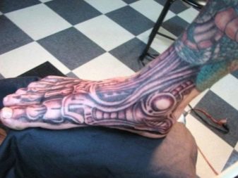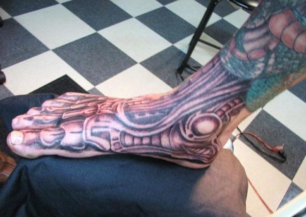 - Imagens bastante populares para homens são desenhos no estilo da biomecânica... E embora a área para tais imagens deva ser extensa, mesmo no tornozelo é possível preencher algum detalhe específico e assim decorar a perna.
