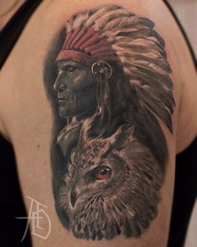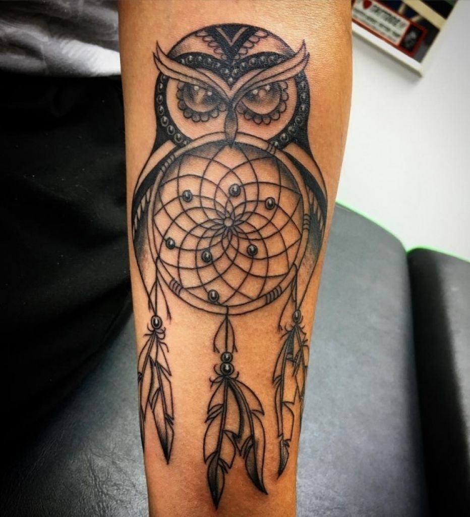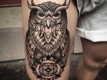 - Coruja com decoração de apanhador de sonhos. Um tipo de desenho igualmente popular que muitos homens escolhem para furar. Essa imagem pode indicar que seu proprietário está procurando a proteção que deseja atrair por meio de uma tatuagem.
