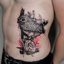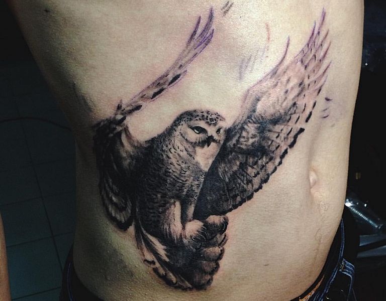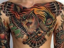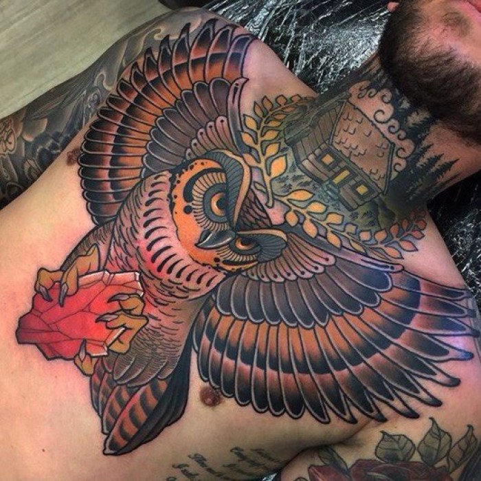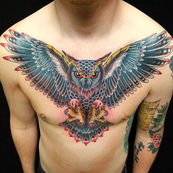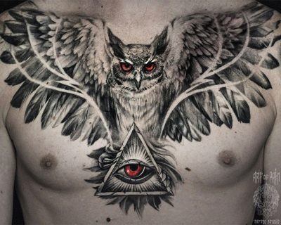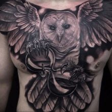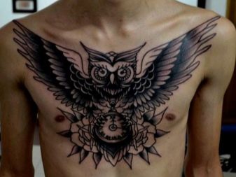 Além disso, os homens costumam fazer uma tatuagem com um pássaro sábio no esterno e nas laterais. Se a coruja é retratada no estilo do realismo no peito, então, desta forma, o homem enfatiza seu amor pela vida, o desejo de alcançar todos os picos, o desejo de longevidade. Além disso, alguns representantes do sexo mais forte obstruem o peito, colocando um significado de amor na tatuagem.