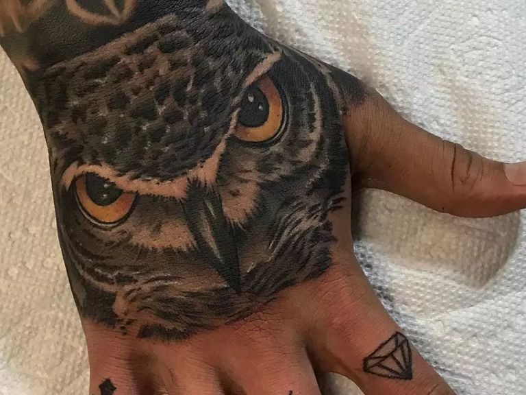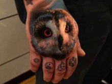 Freqüentemente, um desenho com uma coruja ou uma coruja é pregado por homens na mão ou no pulso. As tatuagens localizadas nessas zonas podem servir como excelentes talismãs-amuletos que protegem seu dono de problemas pessoais, falhas e fracassos, projetos ruins de pessoas malévolas. Basicamente, nas mãos, especialmente no pulso, a ave não é picada de forma realista - aqui, opções gráficas ou geométricas são mais adequadas.