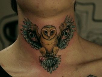 Normalmente, a presença de uma imagem de um emplumado nas zonas em consideração fala da originalidade de uma pessoa, de sua natureza criativa. As corujas no pescoço desempenham o papel de amuletos contra a mentira e a traição. Além disso, eles agem como símbolos de determinação, um forte espírito dos homens.