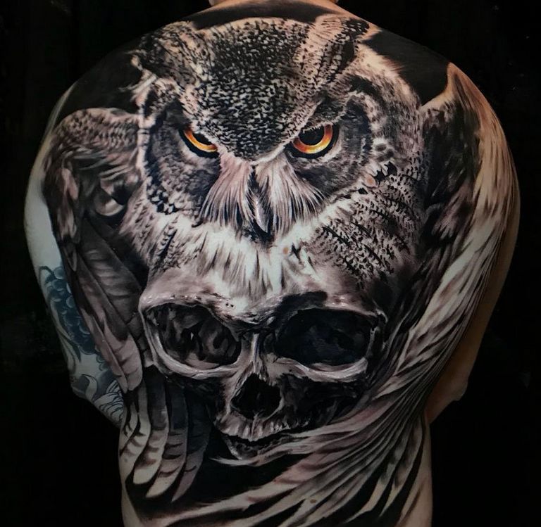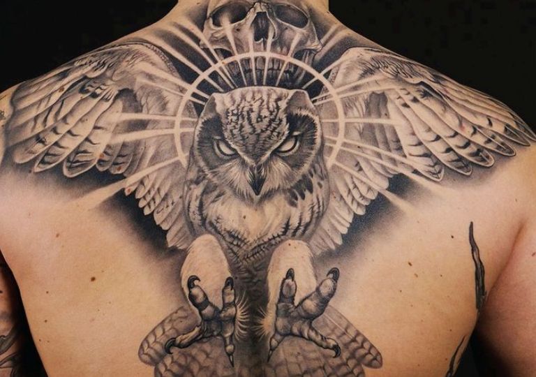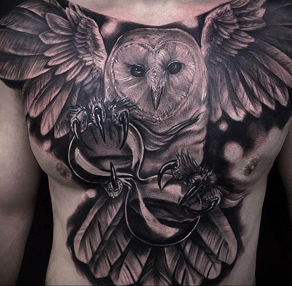 - Imagem cinza e branca de uma coruja, que abriu suas asas no peito de um homem, será outra das opções de tatuagem interessantes. Dos detalhes coloridos, só podem haver grandes olhos de pássaro e alguns elementos decorativos presentes na composição.