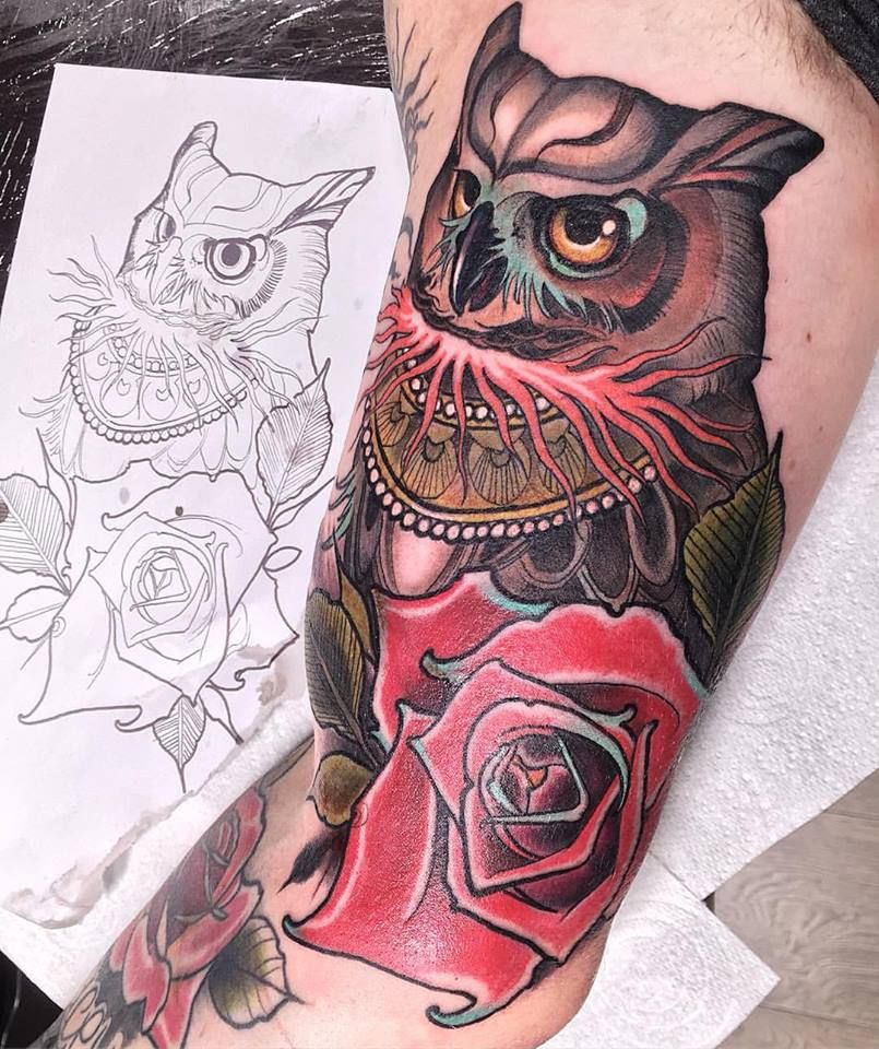 - Neo-tradicional Uma tendência estilística relativamente nova que rapidamente ganhou grande popularidade. Esta técnica é praticada apenas por tatuadores muito experientes, pois é muito difícil de aplicar. O principal "truque" do estilo neo-tradicional é usar as arestas mais claras. As imagens podem ser coloridas ou monocromáticas. O esboço de uma coruja neste projeto pode ser realmente luxuoso.