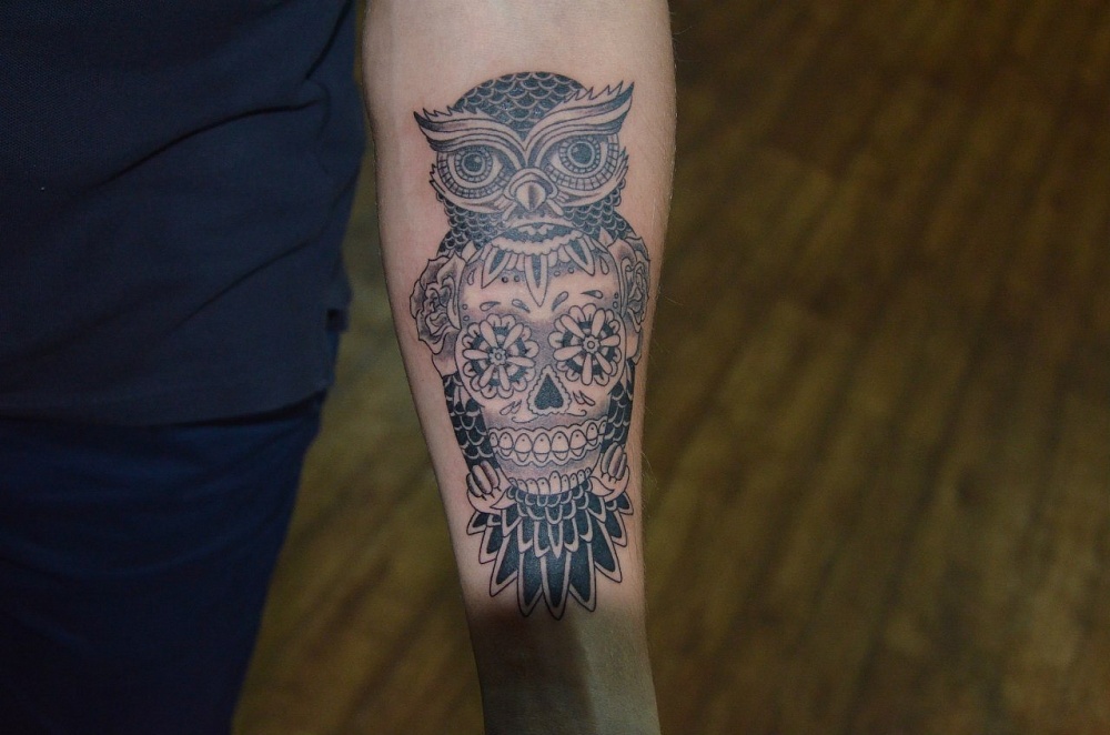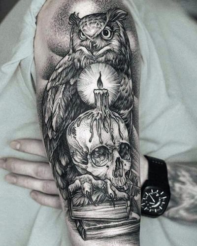 - Composições em preto e branco parecem brutais e misteriosasrepresentando uma coruja zangada, bem como uma caveira com uma vela e livros antigos. Em um design de alta qualidade, essa tatuagem ficará ótima no braço ou antebraço.
