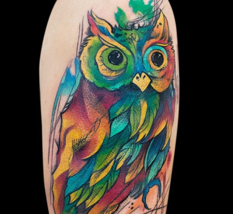 - Imagem de uma coruja séria no peito de um homem pode ser não apenas preto e branco, mas também colorido. A combinação de um grande número de tons diferentes tornará uma tatuagem como esta muito ousada e vibrante.