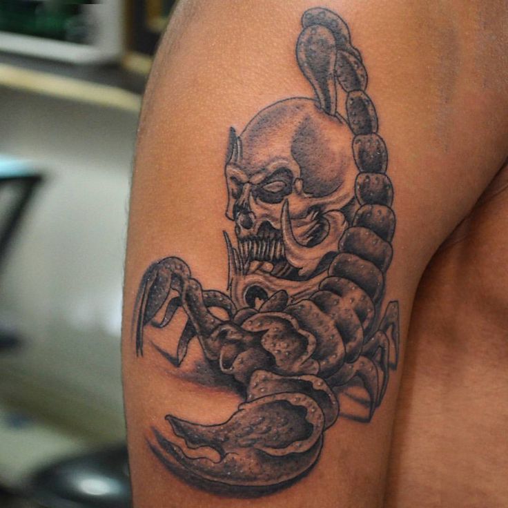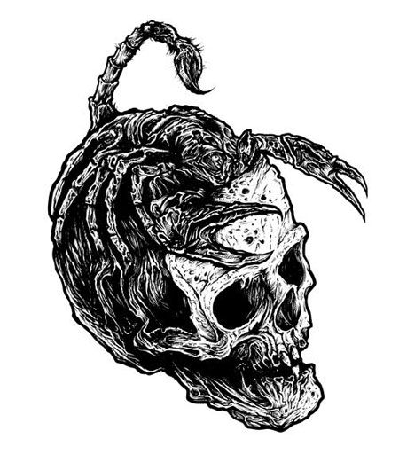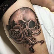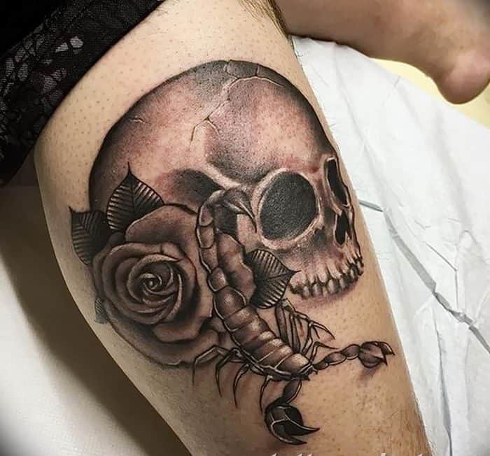 Os homens às vezes dão preferência a essas parcelas, onde o escorpião está próximo ao crânio. É bastante difícil interpretar tal desenho, porque é contraditório em si mesmo: a caveira é tradicionalmente um símbolo de morte para a maioria, e o escorpião personifica o parto. Por esse motivo, tais tatuagens raramente são feitas e na maioria das vezes não são dotadas de uma carga semântica especial, aplicando um desenho no corpo puramente por motivos estéticos.