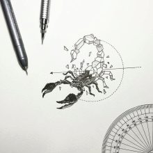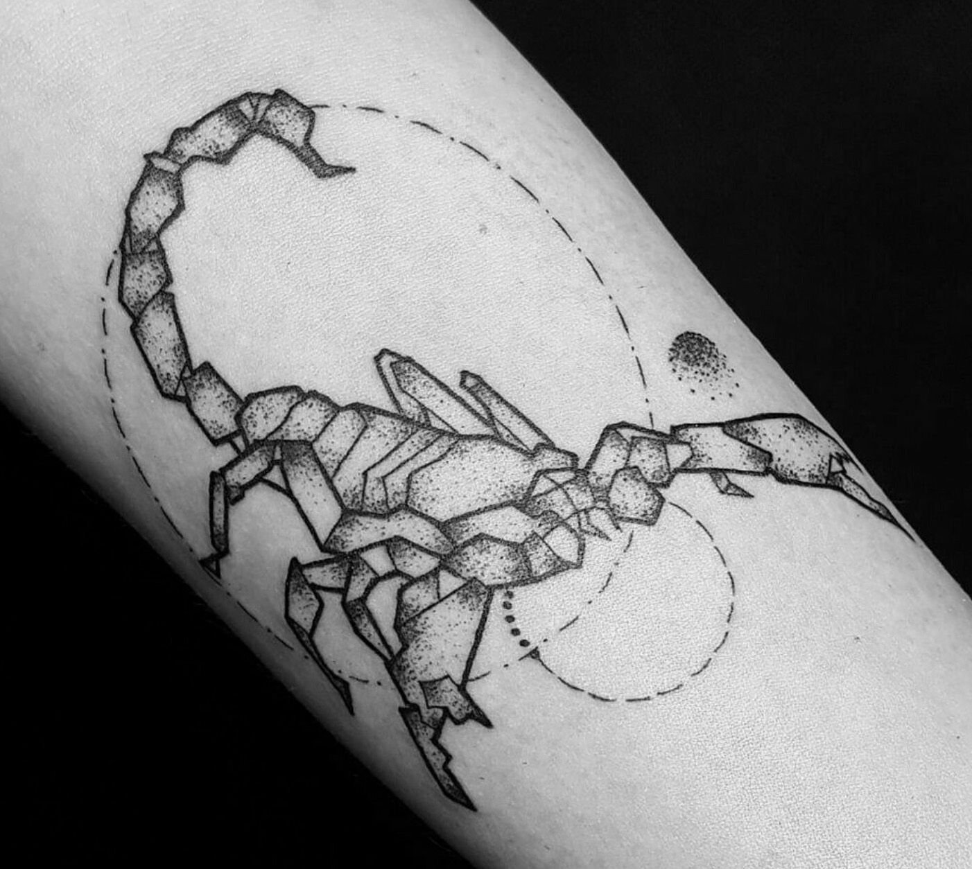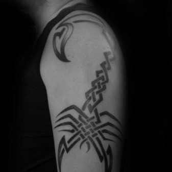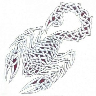Outro estilo interessante que também é adequado para tatuagens de escorpião. Esses desenhos têm um aspecto muito invulgar, o que se deve às linhas utilizadas, que se entrelaçam, formando a imagem de um escorpião, e têm um certo volume ao longo das linhas de dobra.