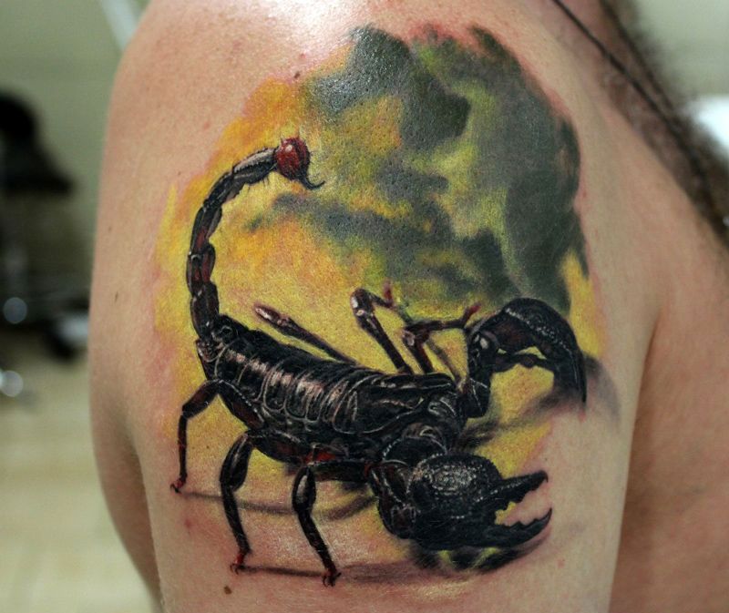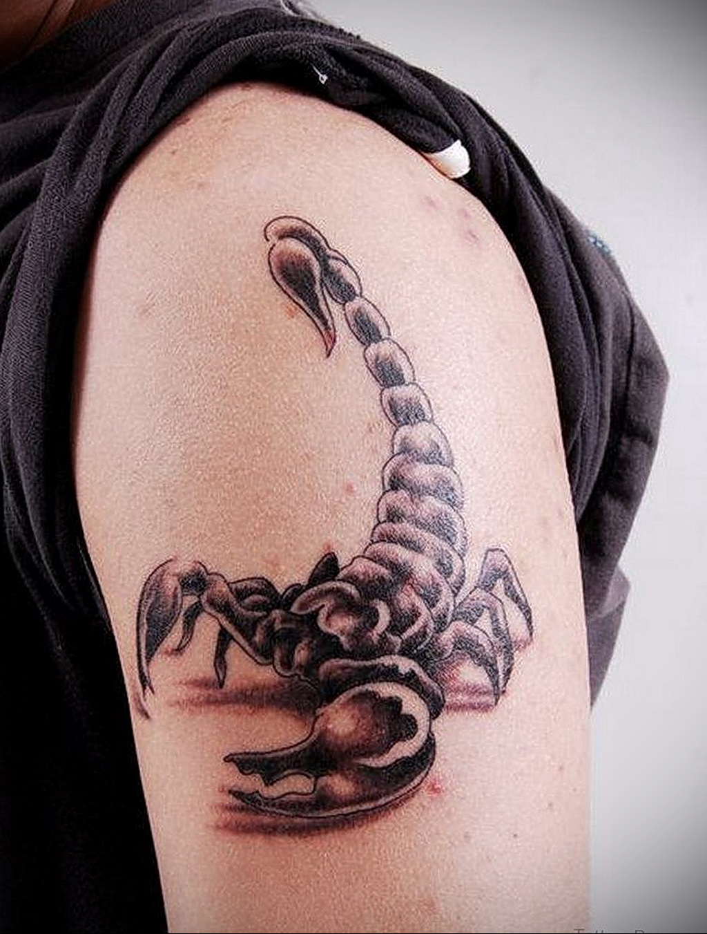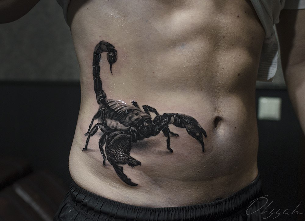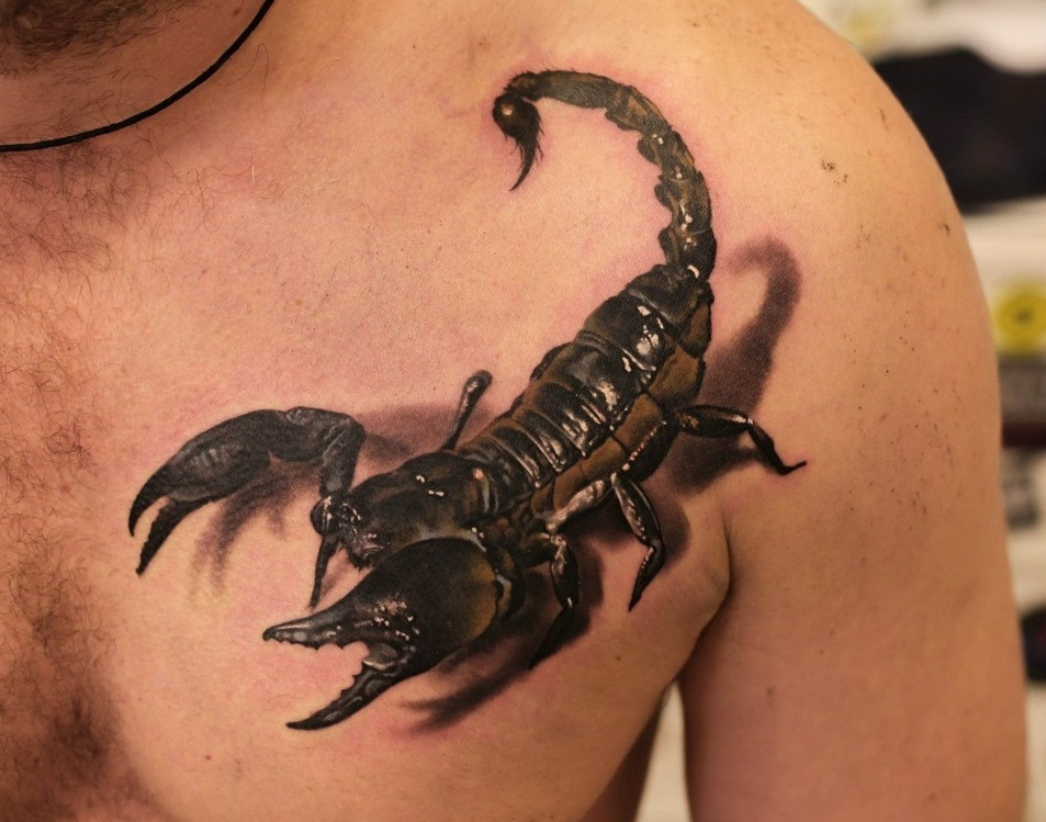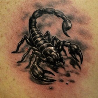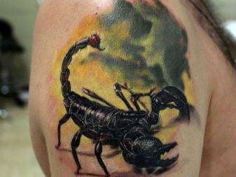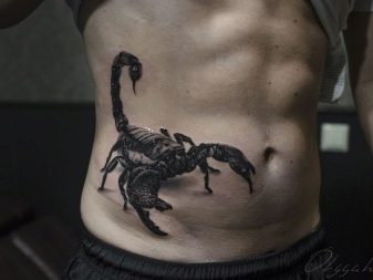 Esta solução de estilo para tatuagens com a imagem de um escorpião é escolhida com mais frequência. Normalmente, as imagens diferem em escala e detalhes. O mestre que trabalha no desenho desenha com cuidado quase todos os detalhes, por isso a tatuagem no final parece naturalista e volumosa. Mas pequenas tatuagens no realismo raramente são feitas, porque é quase impossível atingir esse nível de desenho detalhado nelas.