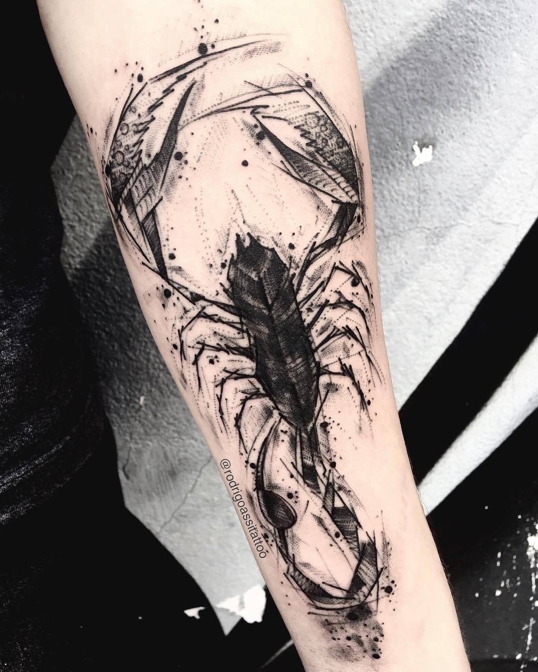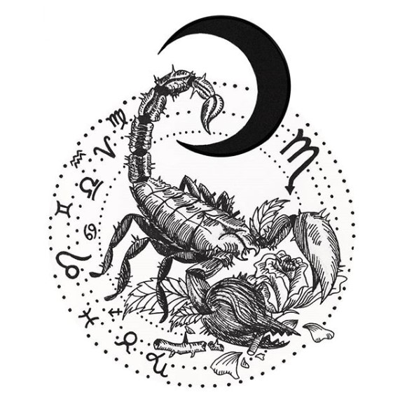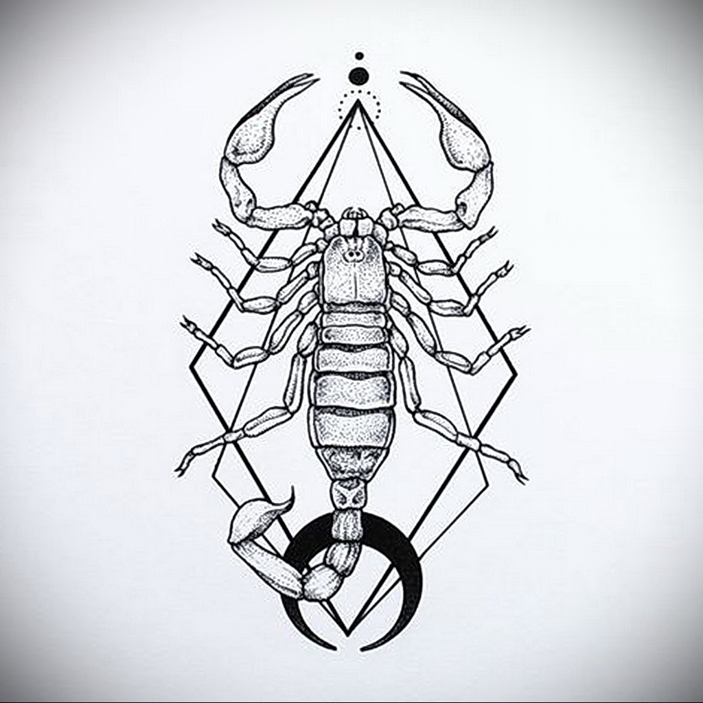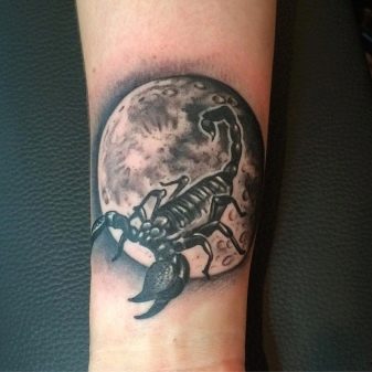 O desenho do escorpião também pode ser complementado pela imagem da lua, caso em que a tatuagem simboliza mistério.... Além disso, muitos têm certeza de que a lua também dobra todas as qualidades características desses insetos venenosos, e que incluem a força e a capacidade de se defender.