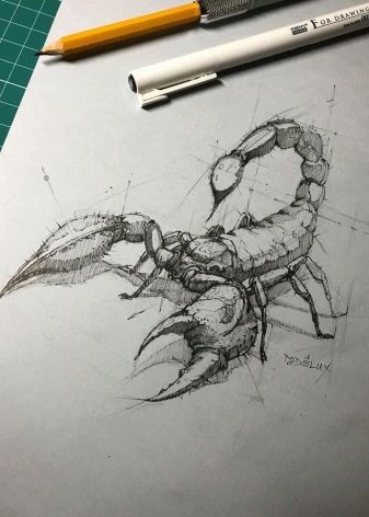 De acordo com o costume, ao retratar um escorpião neste estilo, os artistas usam linhas nítidas e cores brilhantes, a fim de transmitir plenamente todas as qualidades que são dotadas deste inseto venenoso.