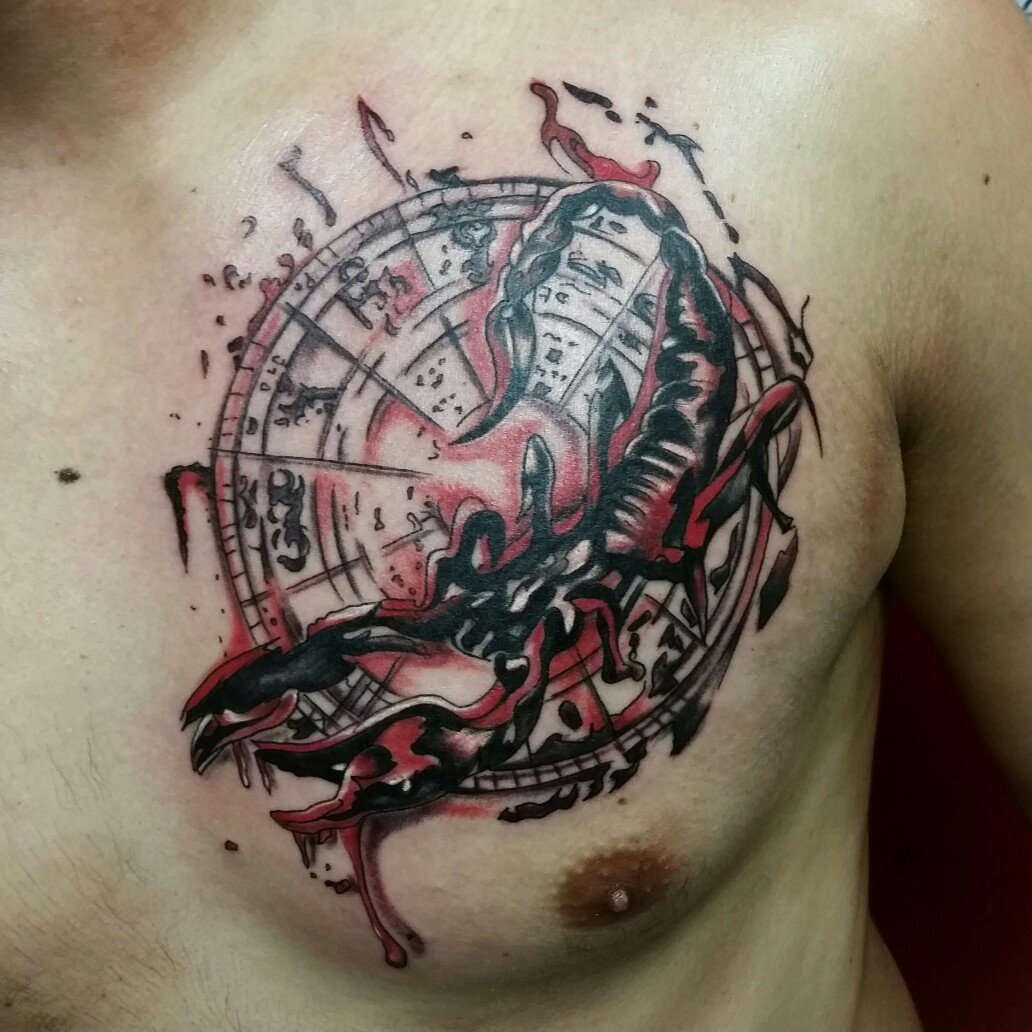 Essa solução de estilo seria muito apropriada para tatuagens com um escorpião. Tradicionalmente, dois tons são usados na polca thrash. - vermelho e preto ou apenas preto. Os próprios desenhos, feitos desta forma, parecem muito brilhantes, são cativantes e perceptíveis, o que se consegue graças às cores utilizadas.