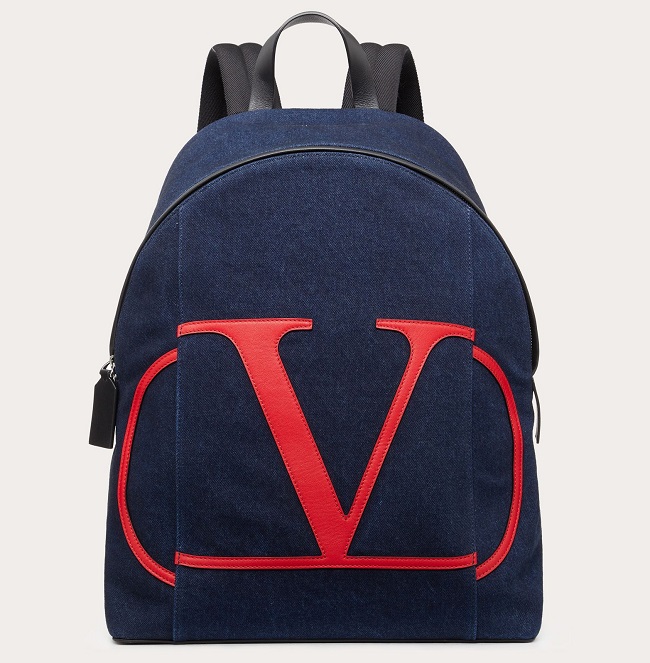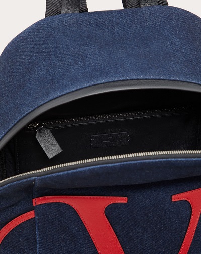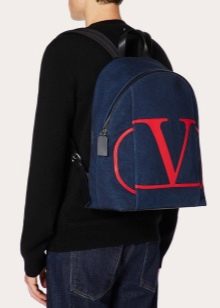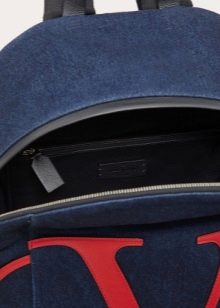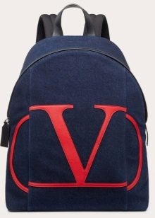 - Sac à dos Valentino en denim foncé, parfait pour un usage quotidien. Les bords du produit sont finis avec des inserts en cuir noir. La poignée et les sangles sont également en cuir. A l'intérieur, il y a des poches pour les petits objets et un compartiment pour les documents. L'accent principal de l'accessoire est une lettre V rouge vif, le décor est en cuir.