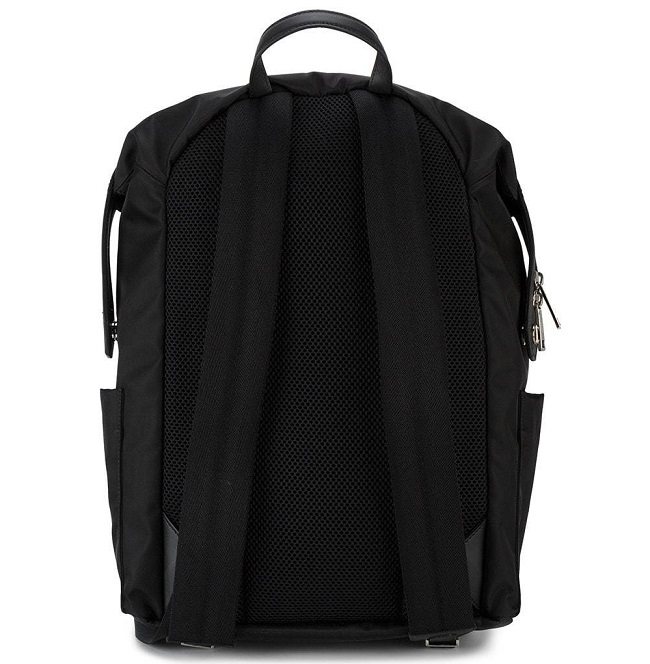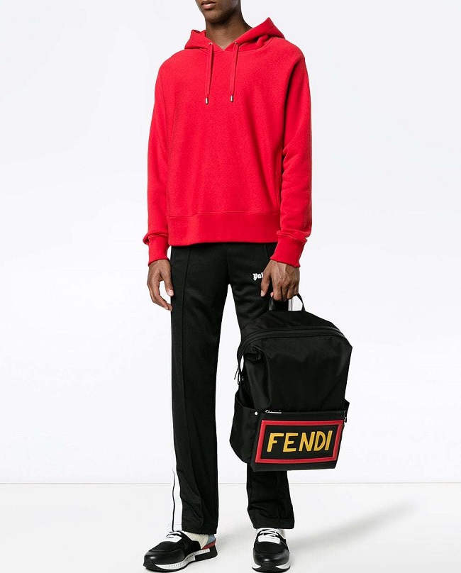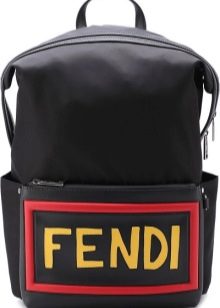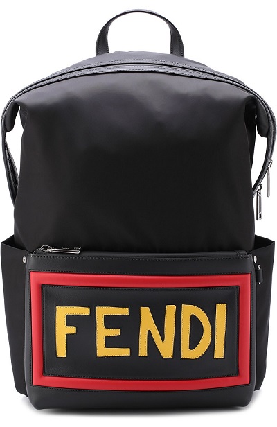 - Un style sac à dos original mais discret Fendi s'intègre parfaitement dans n'importe quel look. Le produit est fait de cuir véritable noir. Le sac a une fermeture zippée et une grande poche avant. Vous pouvez mettre une bouteille ou un téléphone dans les poches latérales. Le point culminant de l'accessoire est un cadre rouge rectangulaire sur la poche avant et des lettres FENDI jaunes à l'intérieur.