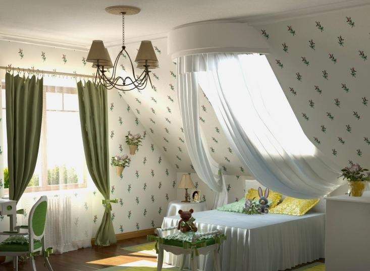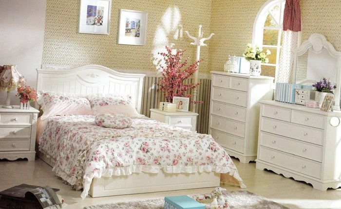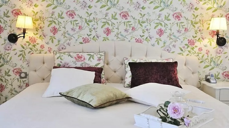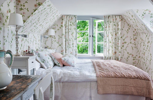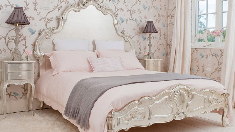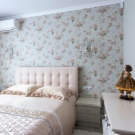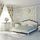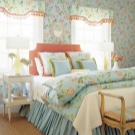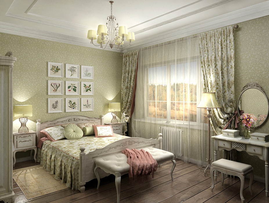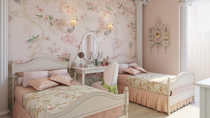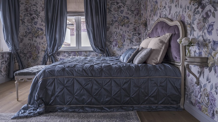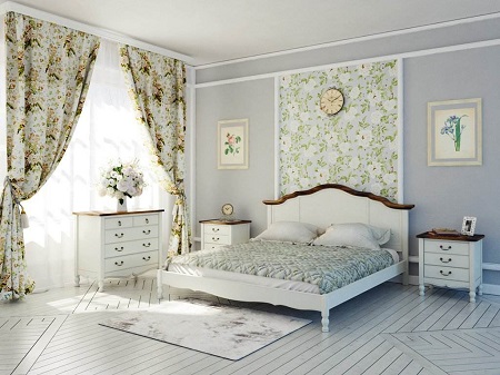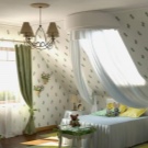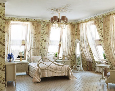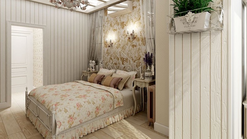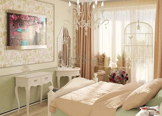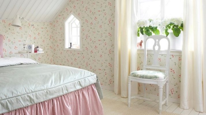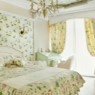 Il convient de noter qu'avec un tel design, la pièce n'aura pas l'air fanée, car les motifs floraux ajouteront du charme à la pièce. Ils doivent être présents dans l'ornement du papier peint, la broderie est encouragée. Le matériau de finition de la chambre peut être une nuance délicate avec des accents lumineux qui ajouteront un peu de contraste.
