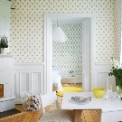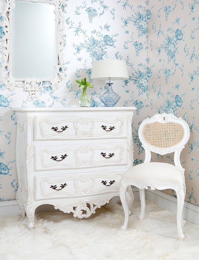 Si vous décidez de décorer les murs de votre pièce avec du papier peint et préférez le style français, vous devez vous familiariser avec les caractéristiques du matériau proposé dans différentes versions. Le papier peint peut être du papier, et il attire beaucoup d'attention. Ce type est le mieux adapté pour la chambre à coucher, de plus, il est sûr et est proposé à bas prix, ce qui correspond tout à fait au style provençal. Vous pouvez travailler avec un tel matériel sans assistance. Quant à la texture, la surface peut être nervurée, rugueuse et lisse, tout dépend des préférences personnelles. Le seul inconvénient est qu'ils ne peuvent pas être lavés, cette option ne convient donc pas à une pépinière.