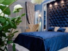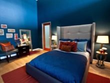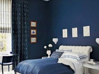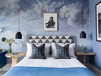 Pour une pièce baignée de soleil brûlant, privilégiez les tons froids, le noir sera épargné en terminant par une combinaison bleu ciel ou bleu et blanc. Si pour un mur le papier peint est choisi en bleu riche ou avec un décor large et actif, alors pour les autres surfaces, il est nécessaire de choisir des nuances calmes. Le plus souvent, un mur aussi lumineux est fait derrière la tête du lit afin que le look ne "se fatigue pas".