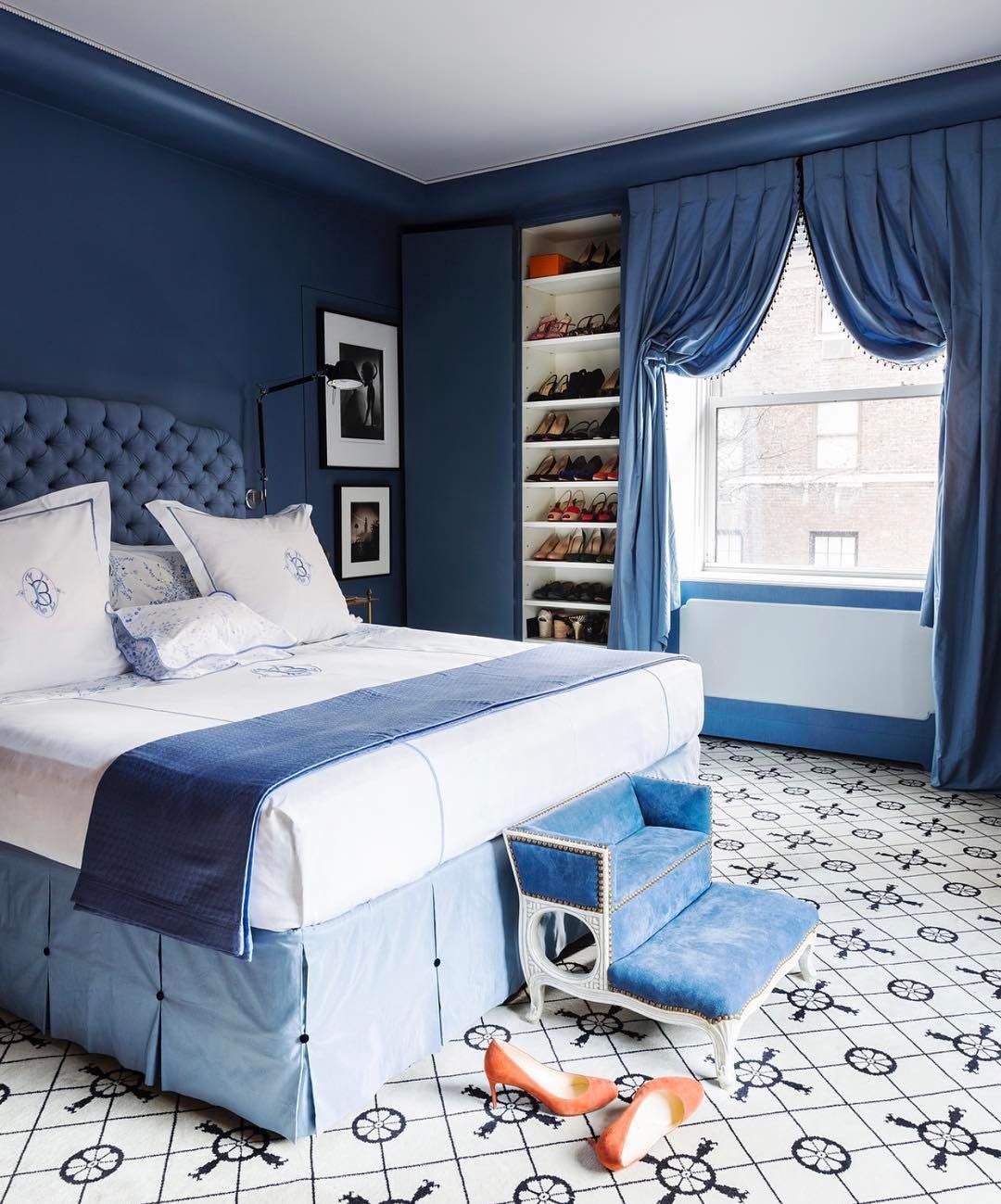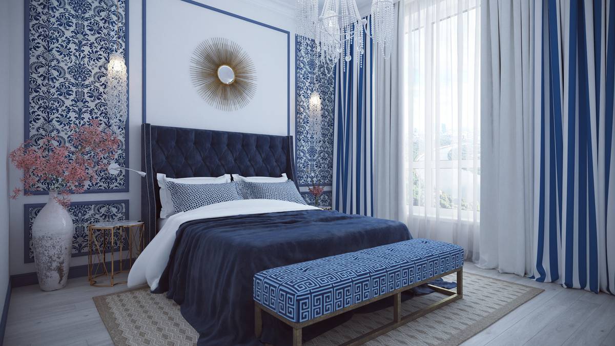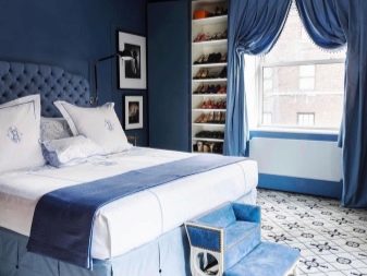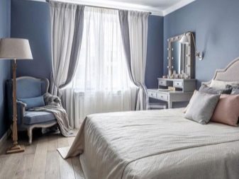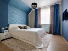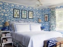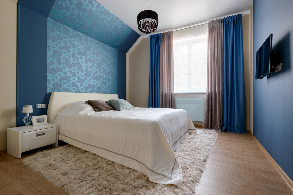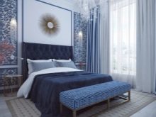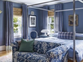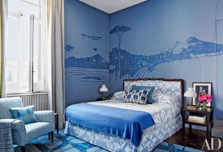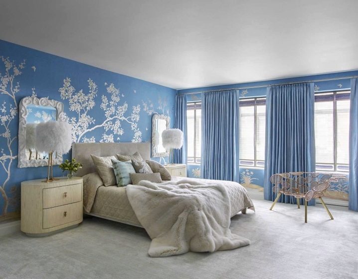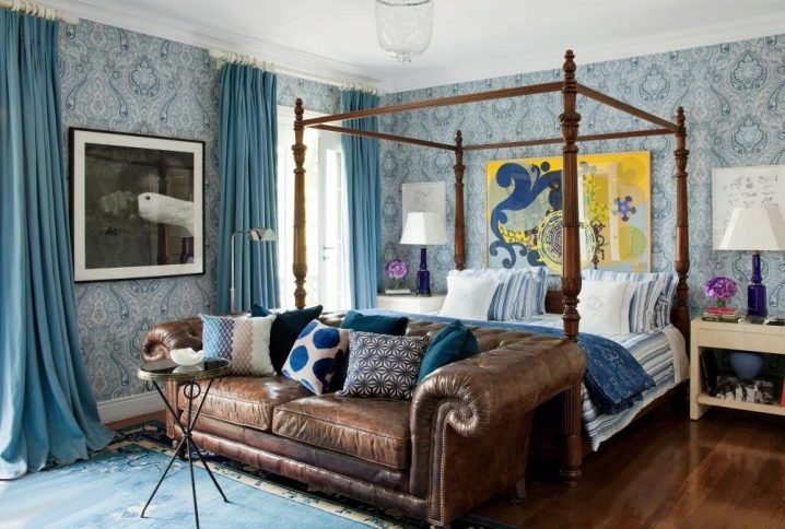 Si la pièce est recouverte de papier peint bleu avec une impression, il est conseillé de coudre les rideaux en tissu uni. Et choisissez leur couleur, en partant des nuances de l'imprimé, pour qu'elles se combinent. À l'inverse, les murs monochromes des chambres donnent vie aux rideaux et aux couvre-lits imprimés.