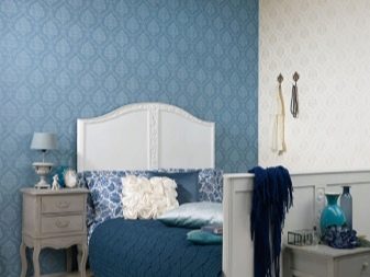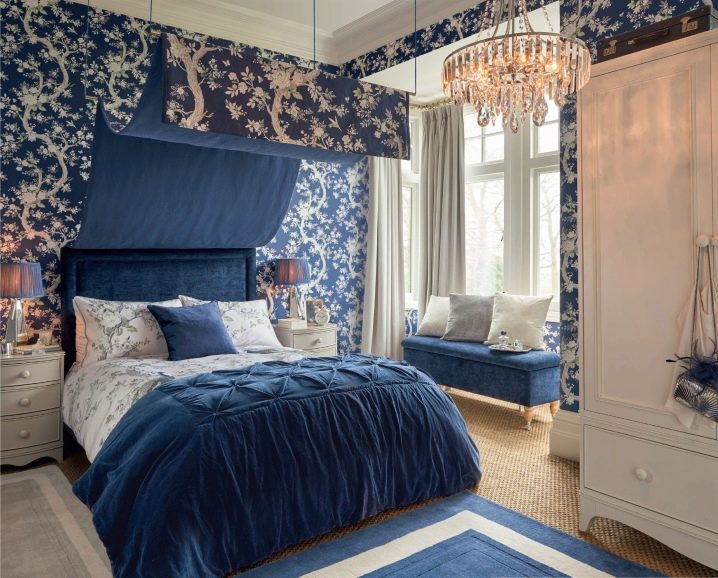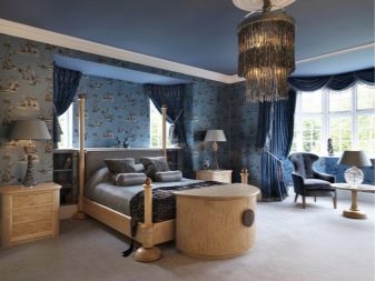 Avec du papier peint, vous pouvez créer une chambre dans presque tous les styles. En parlant de couleur bleue, tout d'abord, ils rappellent les intérieurs britanniques classiques avec des murs saturés monochromes ou un design combiné: une combinaison de papier peint uni et à rayures ou à motifs sur le mur à travers la plinthe.