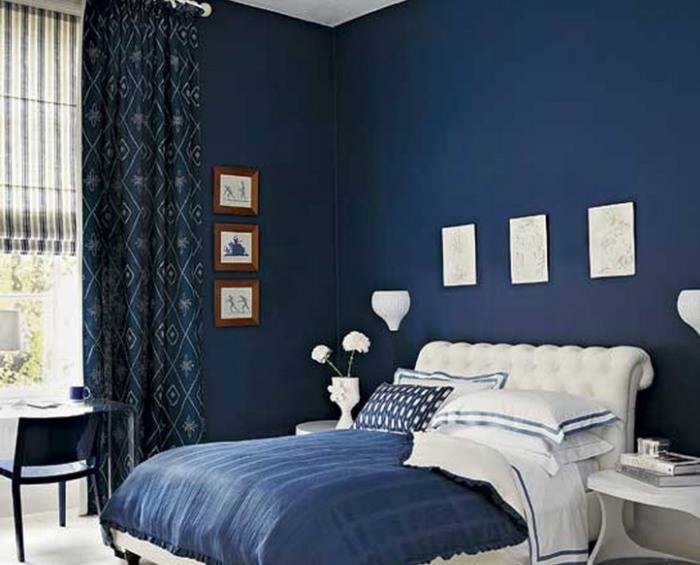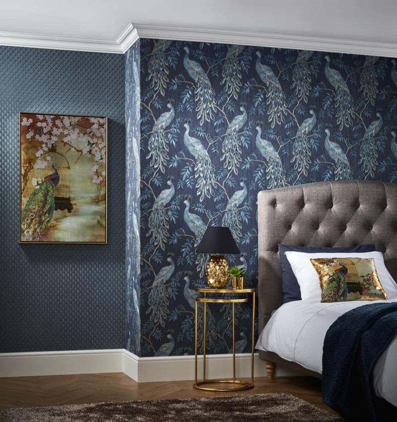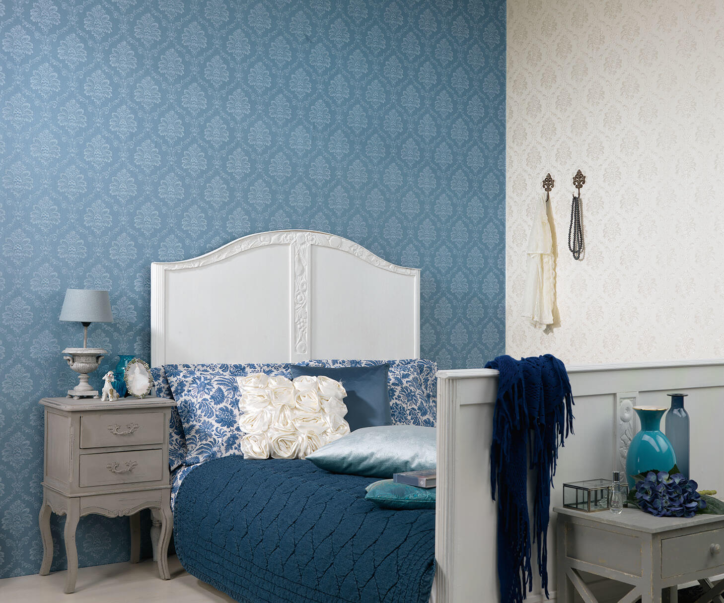 Dans une pièce avec du papier peint dans des tons bleus, divers meubles conviennent. Le lit blanc, l'armoire et les tables de chevet sont très avantageux sur fond de murs cobalt foncé. Les meubles en chêne n'auront pas plus mal : ses teintes miel s'harmonisent parfaitement avec le bleu. Les meubles aux tons de bois rougeâtre et les papiers peints similaires ne seront pas trop sombres avec des textiles abricot ou doré.