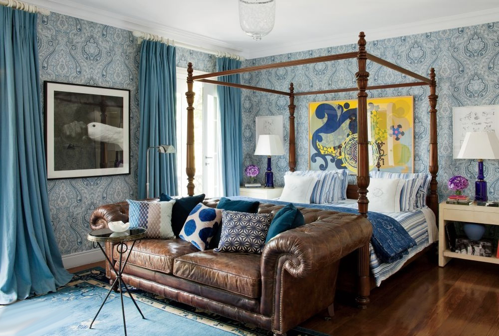 En utilisant la teinte du papier peint dans le rembourrage des meubles, vous pouvez "dissoudre" un lit, un canapé ou un fauteuil dans l'espace. Parfois, cette conception devient une technique de décoration spéciale. L'utilisation de cuir naturel complète très bien les tons bleu-turquoise froids du papier peint. Un canapé en cuir rendra la pièce à la fois chic et cosy.