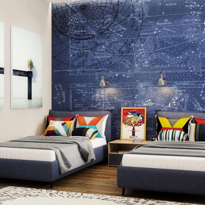Pour une chambre d'adolescent, un papier peint avec une description détaillée des constellations et des corps célestes dans le ciel bleu foncé deviendra une sorte de support pédagogique. Cette couleur se répète dans le rembourrage des meubles et les textiles brillants des oreillers parlent du jeune âge des propriétaires de la pièce.