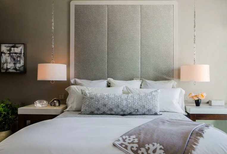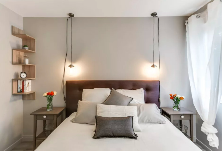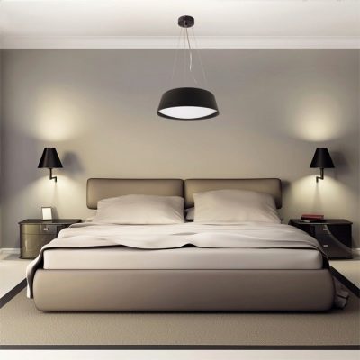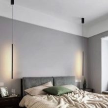 Les appareils LED suspendus peuvent également être utilisés de manière traditionnelle, installés au-dessus de la bordure de trottoir. Dans ce cas, le sentiment est créé que cet équipement d'éclairage plane au-dessus du lit, ce qui donne une certaine apesanteur et légèreté à la pièce. Les plus courantes aujourd'hui sont les lampes qui sont installées sur la table de chevet.... Il est préférable de choisir les mêmes options pour chaque côté du lit afin d'obtenir une symétrie maximale. Ceci est d'une importance primordiale, en particulier pour les intérieurs décorés dans un style classique.
