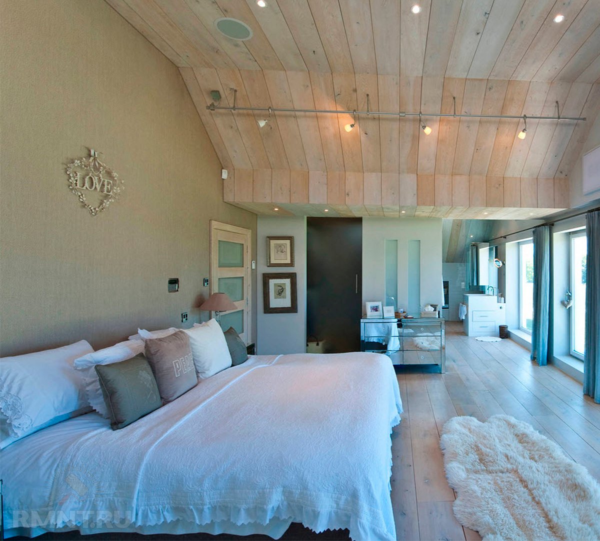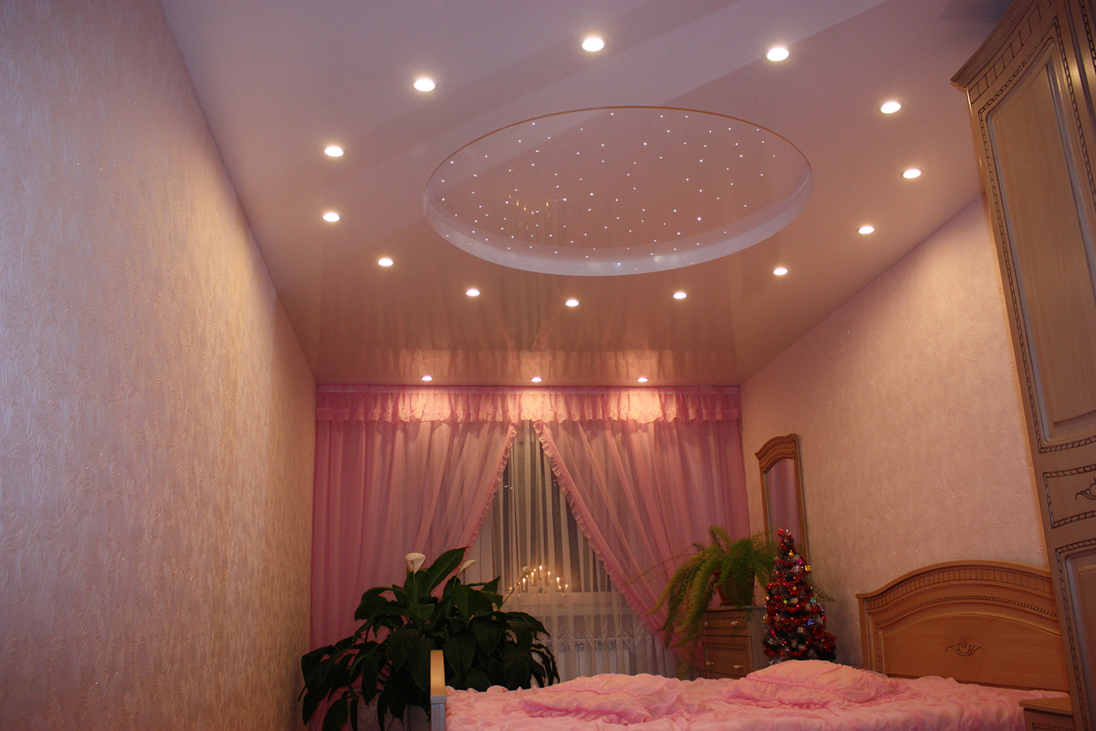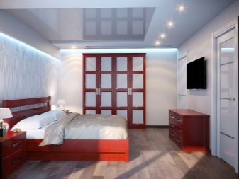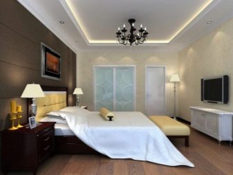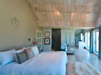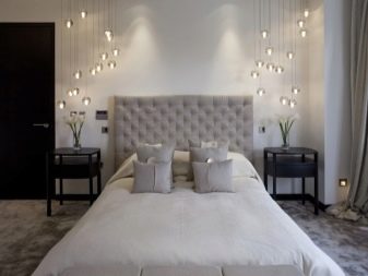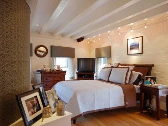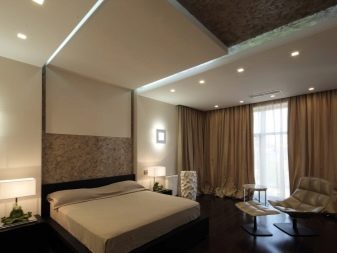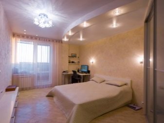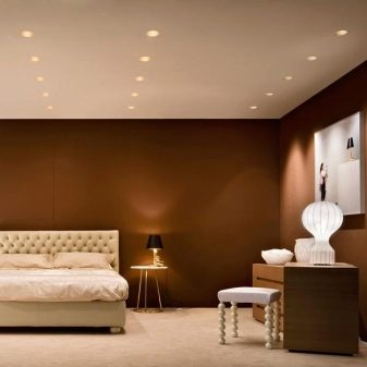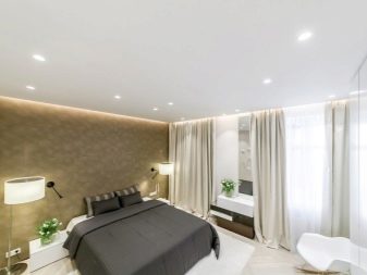 - Placé dans la chambre et projecteurs... L'éclairage est monté en respectant certaines règles. À l'aide de projecteurs, vous pouvez sélectionner le lit de couchage ou le séparer de la zone de travail. Cette option est particulièrement attrayante dans les pièces décorées dans un style classique ou ultra-moderne.