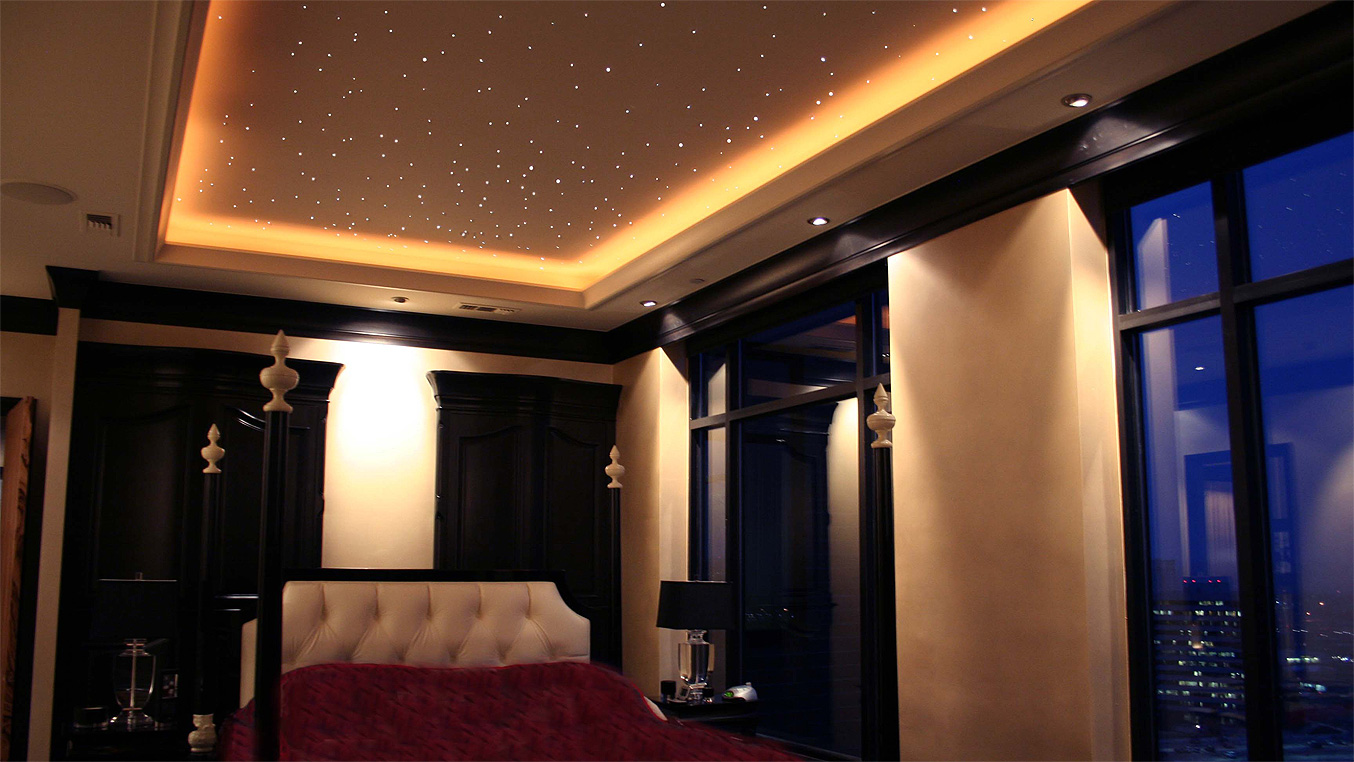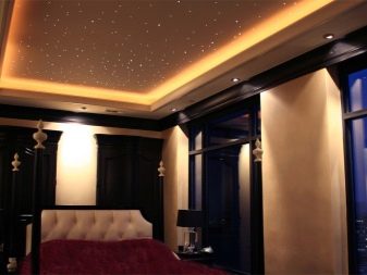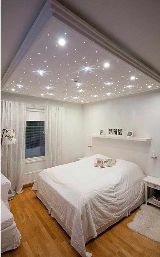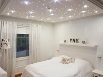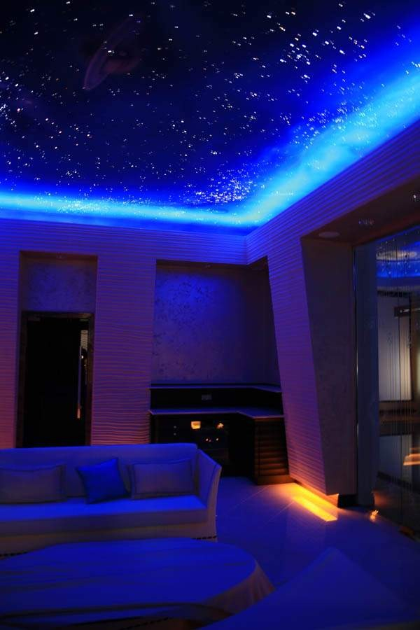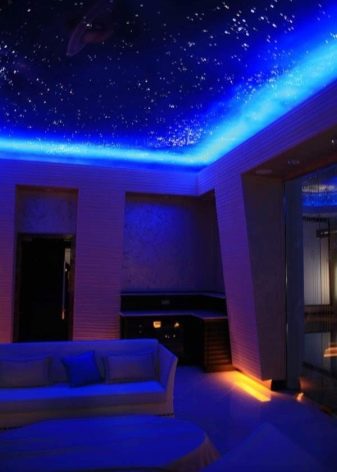 - L'illumination en forme de ciel étoilé est belle et originale. Cette option n'est pas facile à mettre en œuvre, mais elle en vaut la peine. Cette solution est particulièrement souvent utilisée pour l'ameublement des chambres. Tout d'abord, un film spécial est posé au plafond, peint en noir ou en bleu foncé. Les projecteurs sont placés sur une courte distance. L'emplacement ne doit pas être en rangées, mais chaotique. Cela donnera à la structure un aspect naturel.