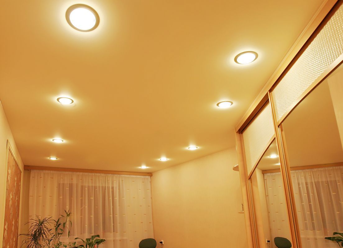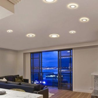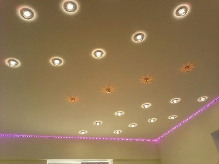 - Installation combinée des dispositifs ponctuels sont placés autour du périmètre à égale distance du lustre situé au centre de la pièce. Ils remplissent une fonction auxiliaire, grâce à laquelle un éclairage confortable est obtenu.