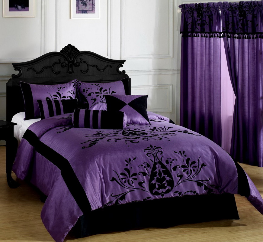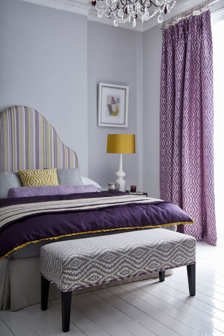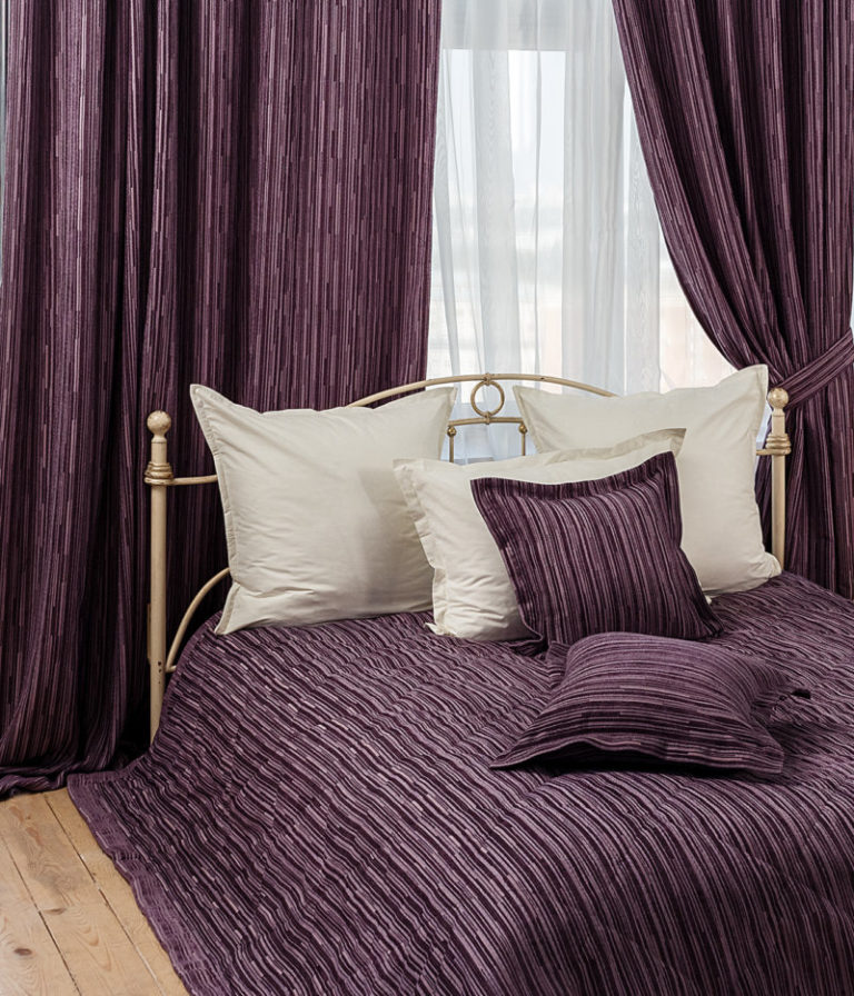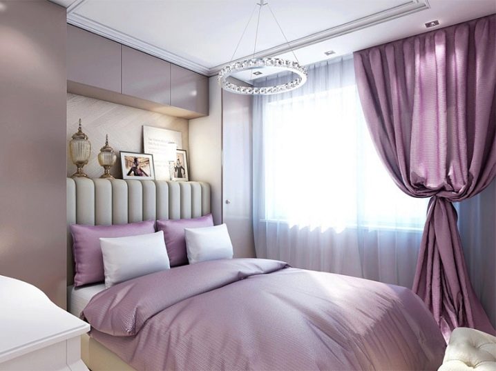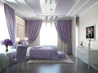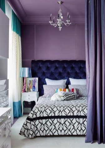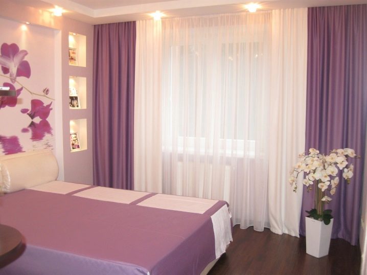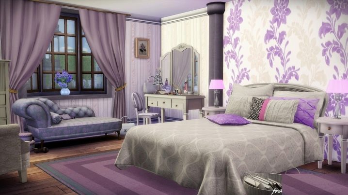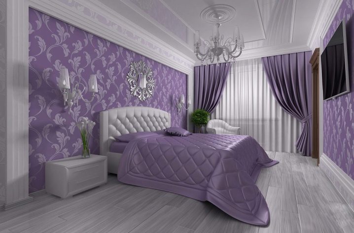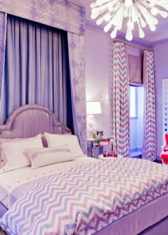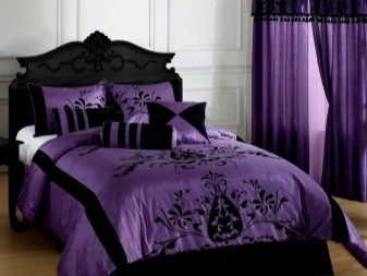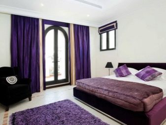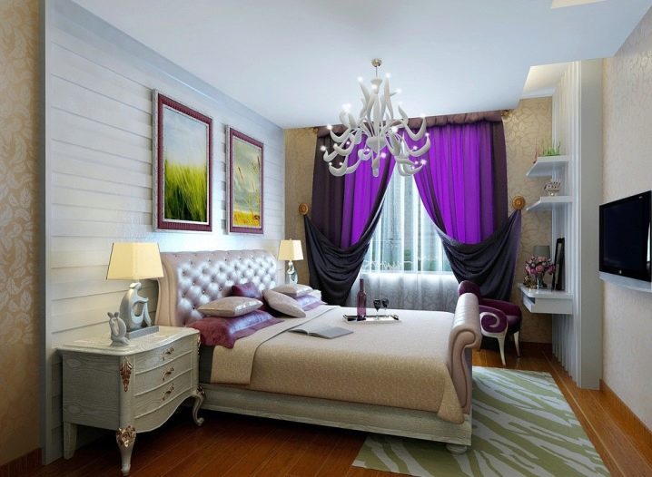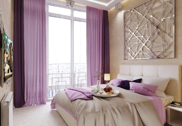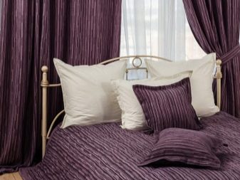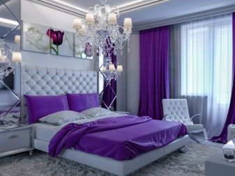 Pour que les rideaux violets ne se détachent pas du fond de la chambre avec un seul point de couleur, ils peuvent être soutenus par des éléments décoratifs de la même palette de couleurs. Par exemple, il peut s'agir non seulement d'un couvre-lit, mais aussi d'oreillers de lit, d'un beau vase. Le violet se marie bien avec l'argent et l'or.