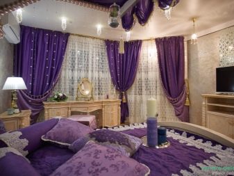 Outre, avec le bon choix de teinte, ils peuvent décorer d'autres directions de conception (classique, scandinave, style oriental, baroque). Les rideaux violets ont l'air inhabituels et originaux dans la chambre. Ils conviennent aux finitions de murs et de sols de différentes couleurs.