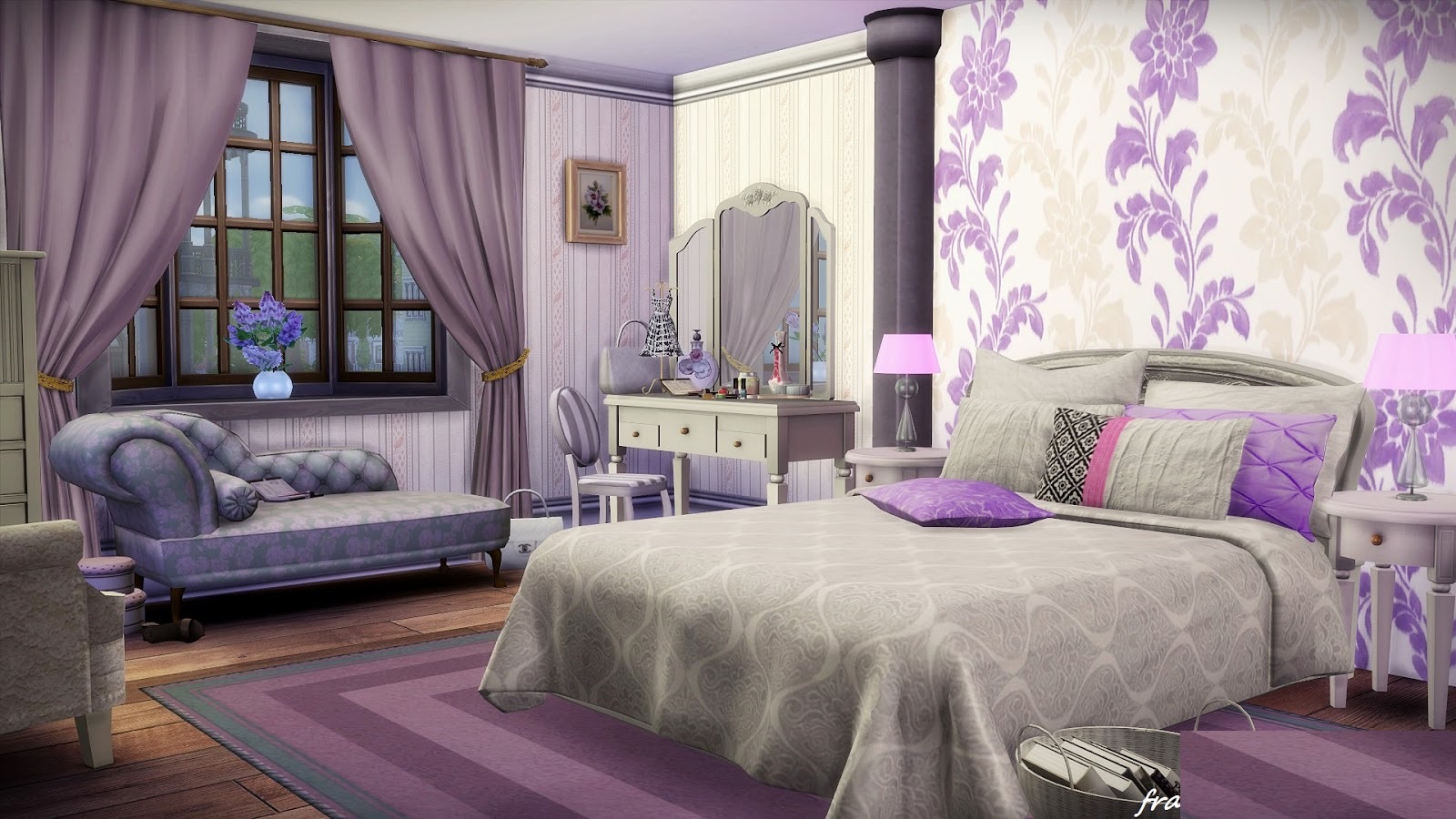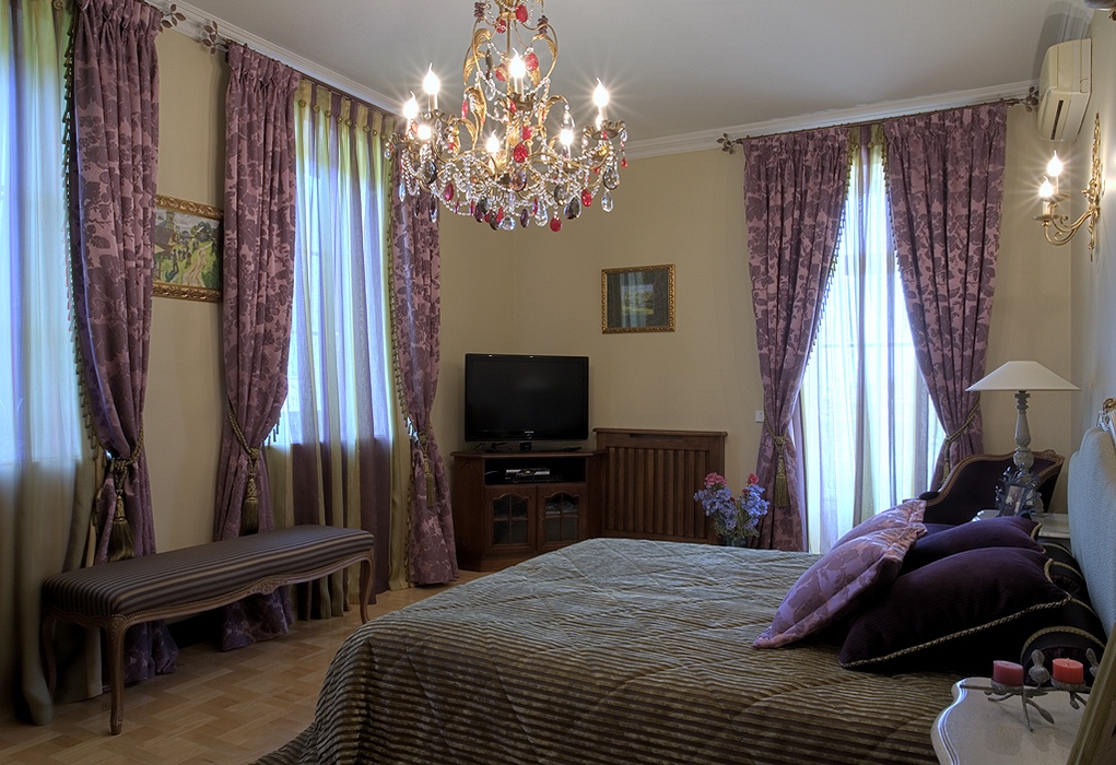 - rideaux violets pour les fenêtres des chambres, choisis pour correspondre aux éléments décoratifs de l'intérieur;