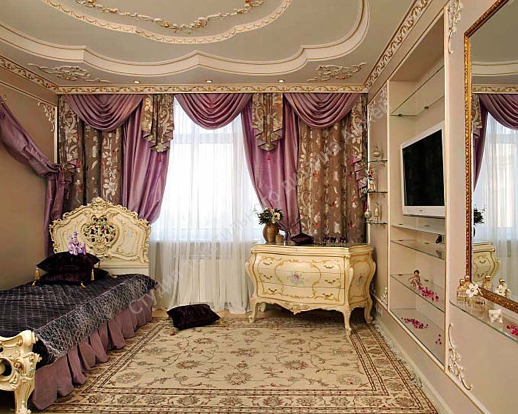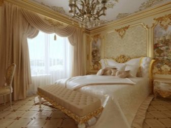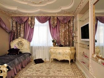 - Pour l'intérieur de la chambre dans le style baroque les rideaux qui soulignent ses caractéristiques conviennent. Ils incarnent un ancien amour du luxe apparu en France à la fin du XVIIIe siècle. Les rideaux baroques sont combinés avec du stuc sur les murs et le plafond, des meubles anciens prétentieux, des miroirs dans de grands cadres à motifs avec dorure. La tringle à rideau doit également être suffisamment sculptée et massive pour résister aux tissus épais tels que le satin, le damas, le velours, le jacquard, agrémenté de broderies, de glands surdimensionnés, de franges et de plis complexes.