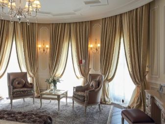 - Néoclassique diffère par sa sévérité et sa simplicité, mais en même temps, les rideaux, tombant magnifiquement sur le sol, sont cousus à partir de tissus coûteux. Ils peuvent être décorés de lambrequins et de dentelles décoratives à pompons. Cette solution d'intérieur avec une grande hauteur sous plafond, multi-ailes ou baie vitrée vous permet de combiner avec succès la retenue classique noble avec le confort moderne.