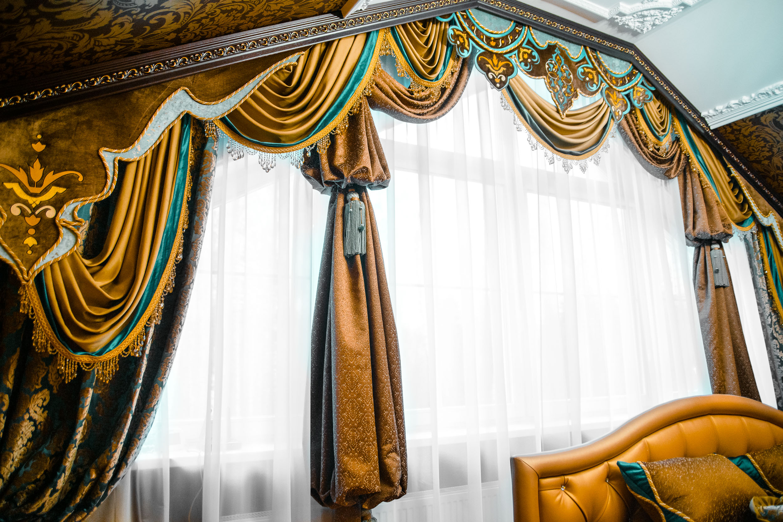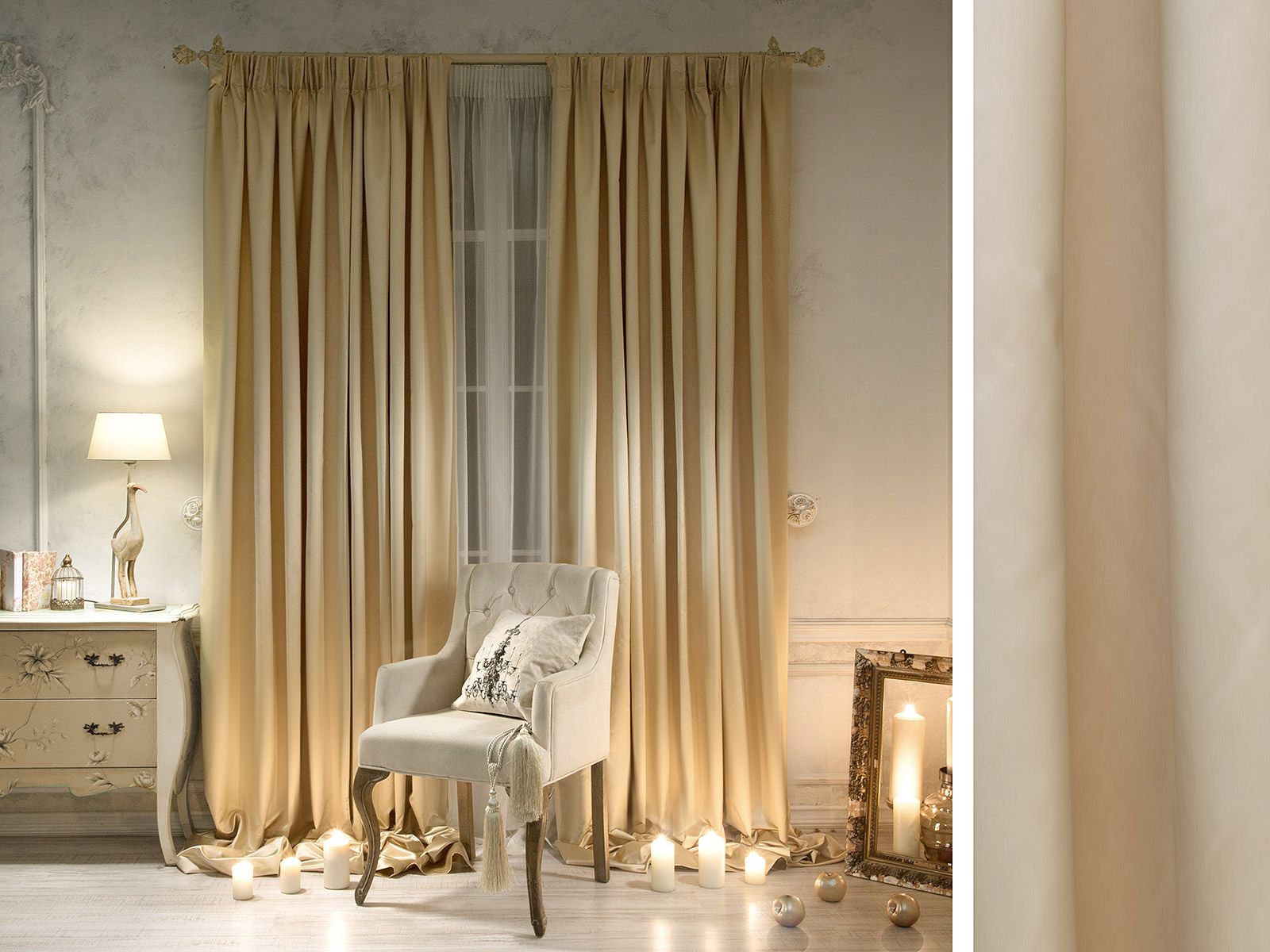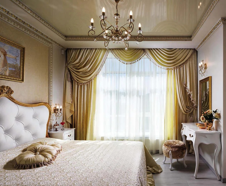 - Des rideaux moutarde ou beige avec de gros ornements dorés et des lambrequins d'une teinte plus claire décoreront richement l'intérieur de la chambre.