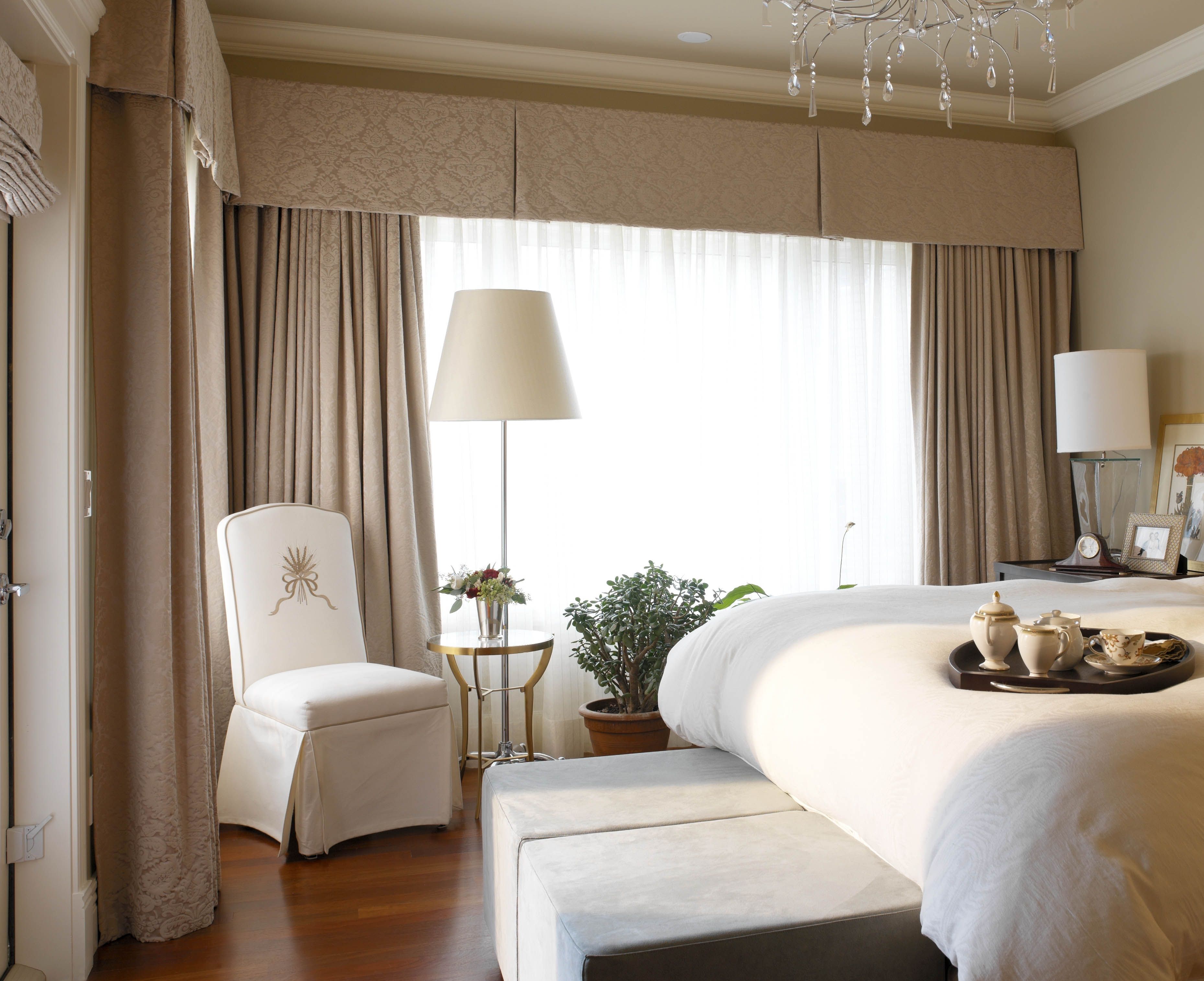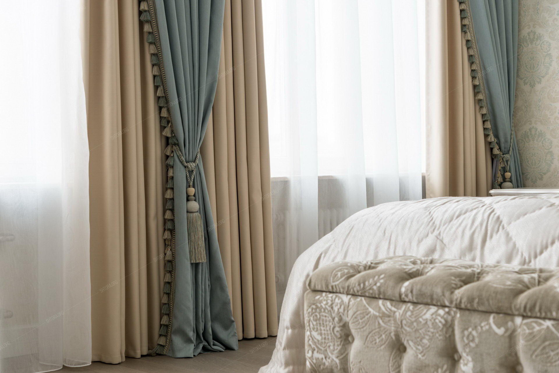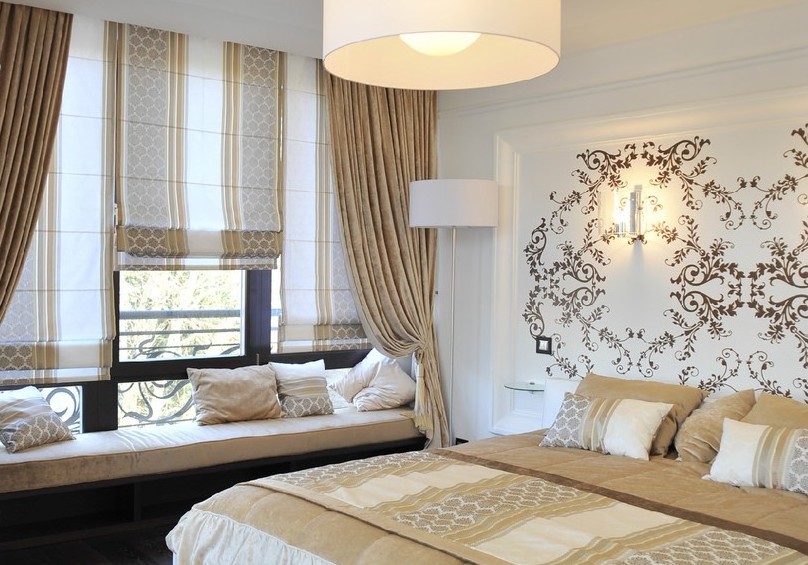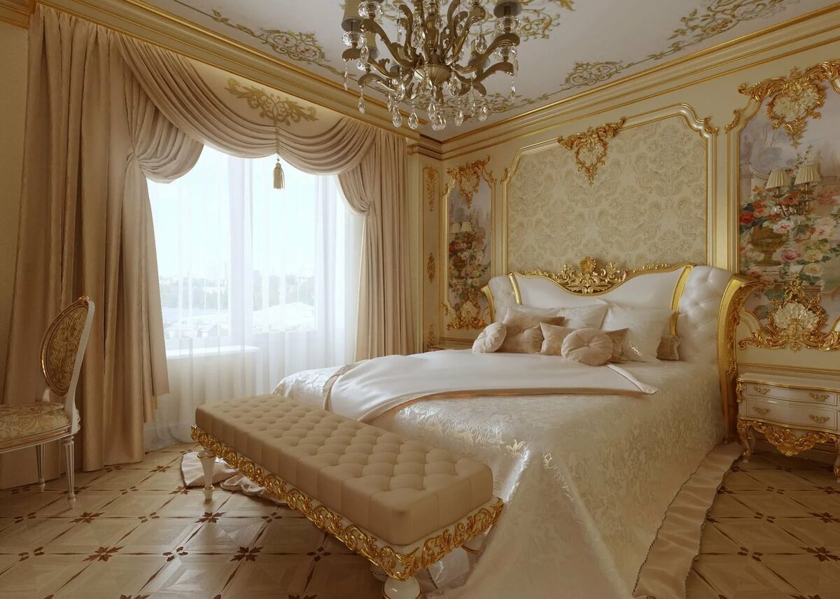 - Des rideaux moutarde ou beige avec de gros ornements dorés et des lambrequins d'une teinte plus claire décoreront richement l'intérieur de la chambre.