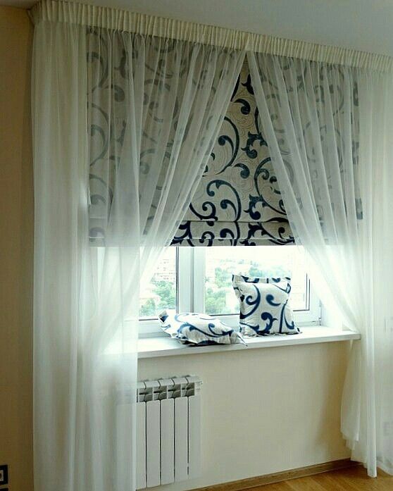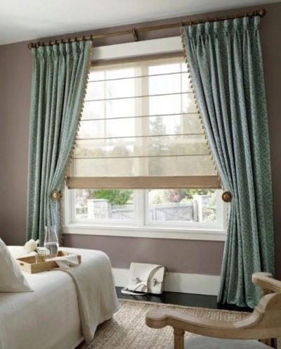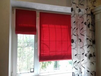 - S'il y a plusieurs fenêtres dans la chambre, vous pouvez expérimenter en combinant des stores romains avec des rideaux ou du tulle. Ou accrochez des rideaux romains à toutes les fenêtres, mais de différents types et de différentes couleurs.