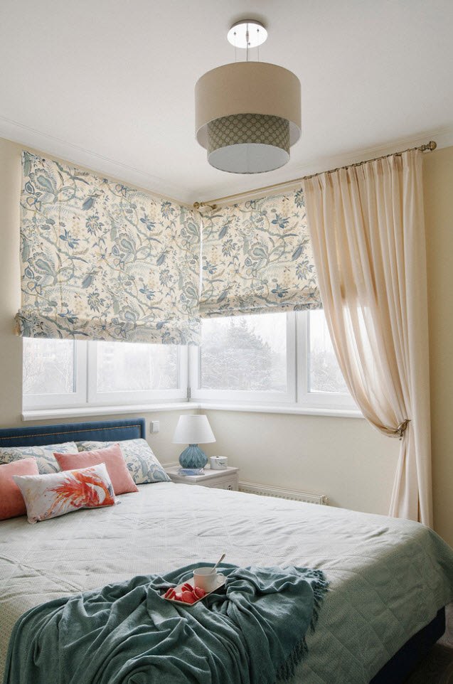 - Les rideaux en tissu épais, installés sur les fenêtres d'angle, sont capables de protéger des rayons du soleil. De plus, il vous permettra de régler l'éclairage dans la chambre.
