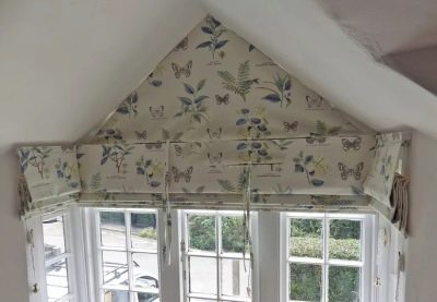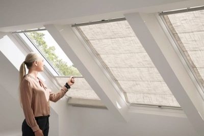 - Les stores romains installés sur les fenêtres inclinées les accentuent et soulignent leur forme inhabituelle.